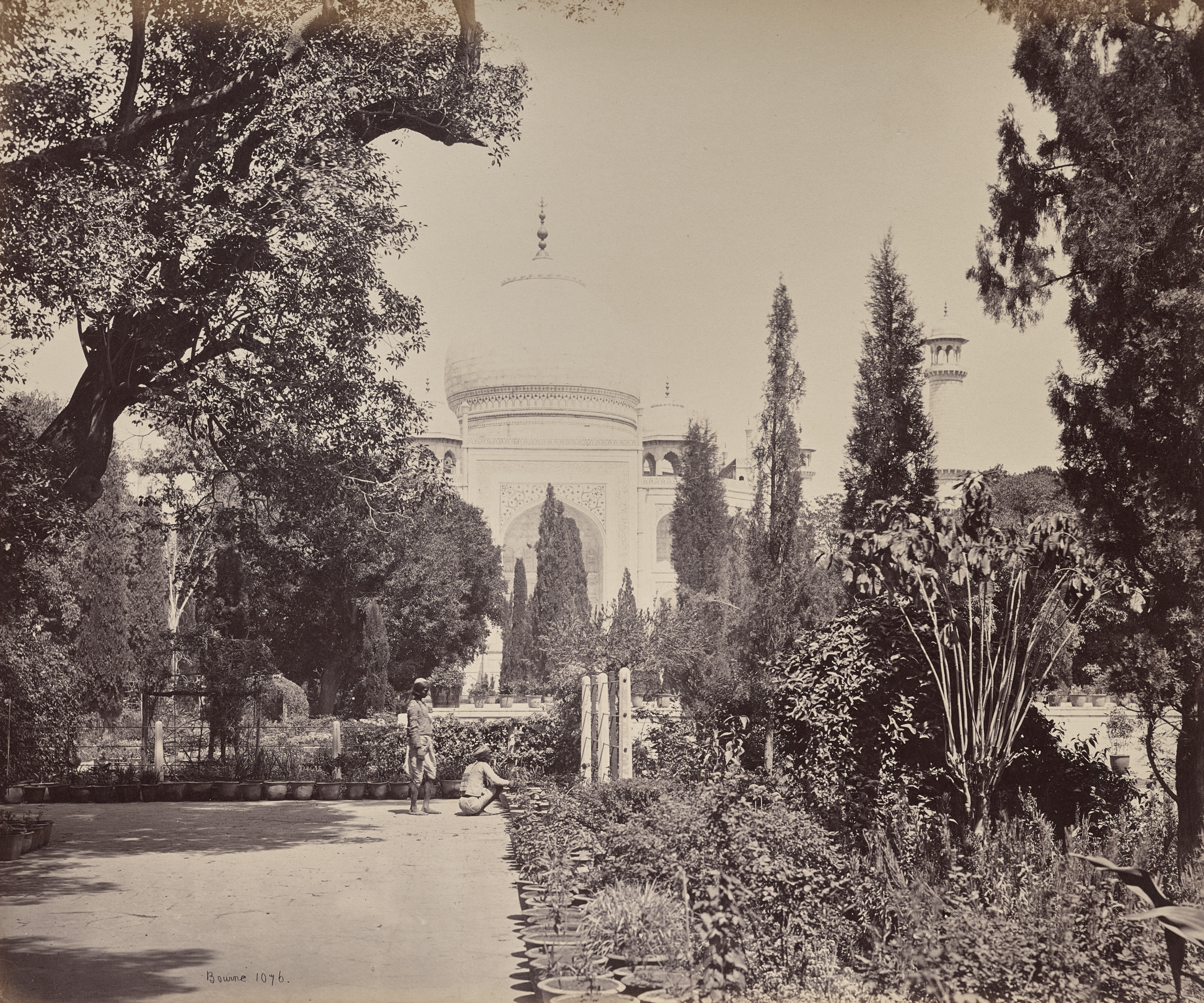 The photograph shows a black and white view of the Taj Mahal from a garden. The Taj Mahal has a large central dome surrounded by a smaller dome on either side and has a detailed carved design. A path leads to the Taj Mahal, flanked by trees and shrubs on both sides. A man stands on the path holding an object and another sits cross-legged on the path. Potted plants and trees line both sides of the path and a large tree dominates the left side of the image. The photograph is sepia-toned.