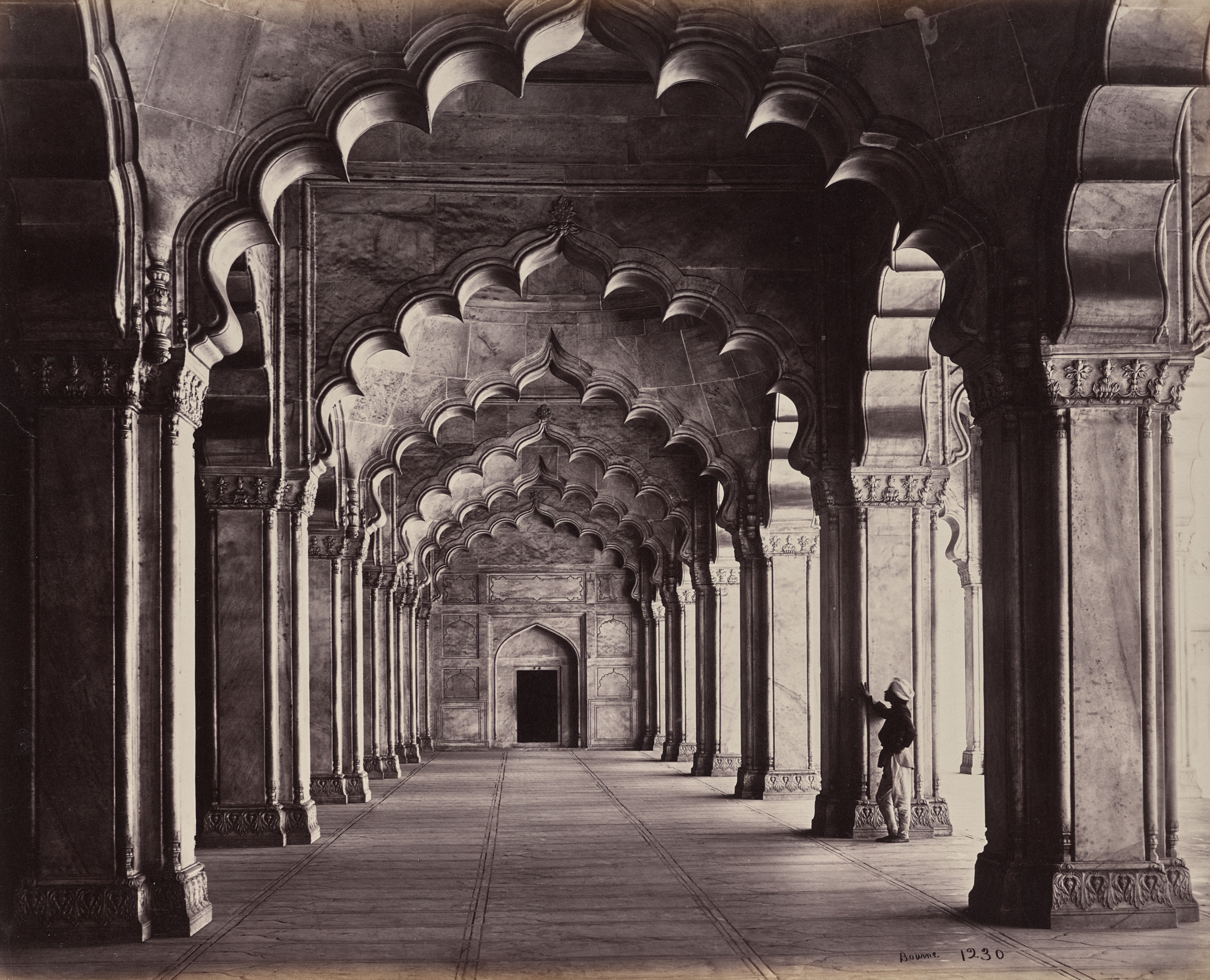 The image shows a black-and-white photograph of an interior view of a mosque. The photograph is taken from one end of a long aisle, looking down its length. The aisle has a tiled floor and is flanked by rows of columns with intricate carvings. The columns have a scalloped design at the top and are topped with ornate capitals. The ceiling is made up of a series of arches, each one supported by the columns. The arches are also scalloped and have a decorative design. The walls are made of stone or marble and have a smooth finish. At the far end of the aisle, there is a doorway with an arched top. A man stands in the aisle, leaning against one of the columns on the right side. He is wearing a turban and traditional clothing. The overall atmosphere of the image is one of grandeur and elegance.