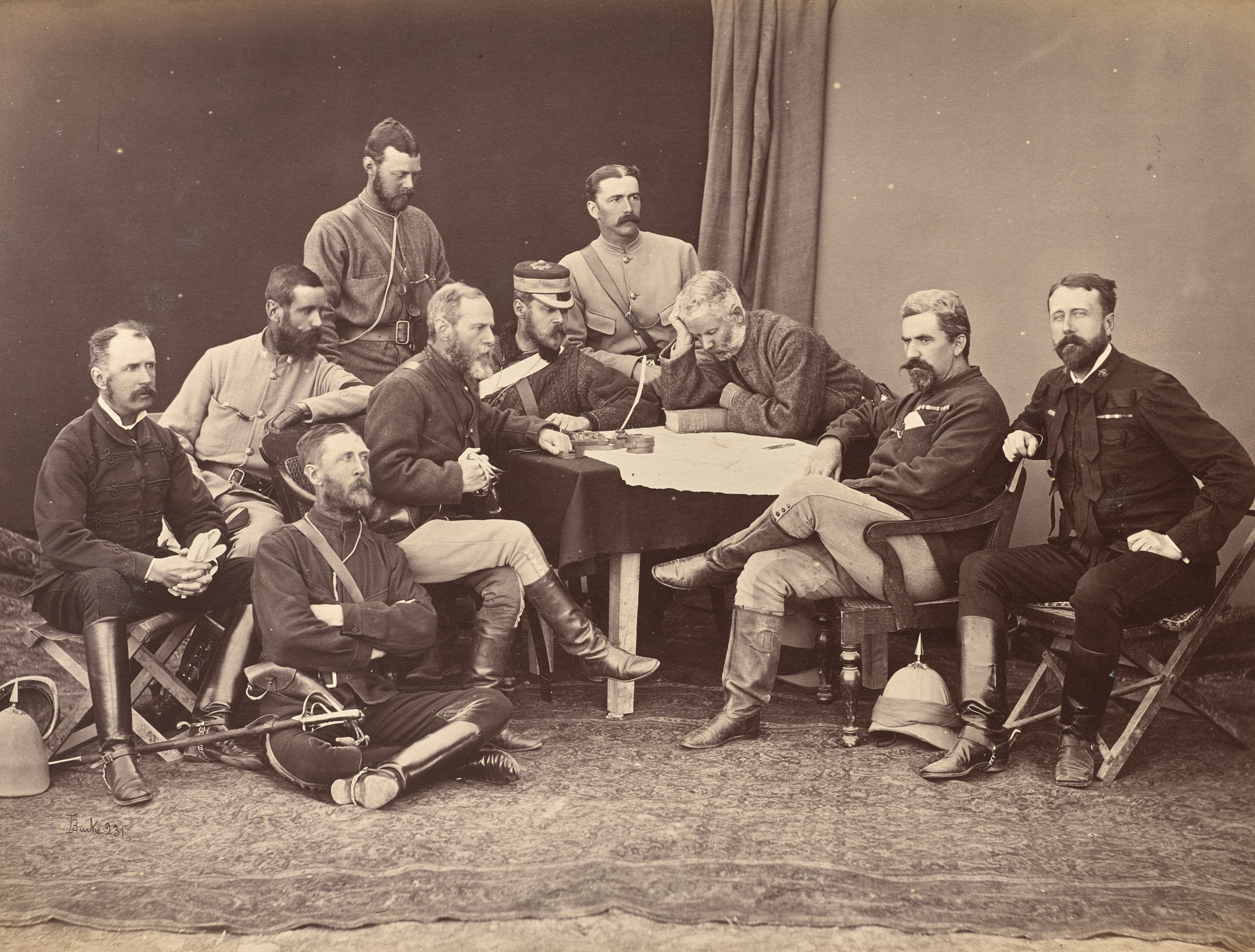 Sepia-toned photograph of a group of men in military uniforms. A man in a dark uniform sits on the left. Beside him, a man sits on the ground with his back against a chair. Four men sit around a table in the center, one wearing a hat. Two men stand in the back. Two men sit on the right side, one resting his head on his hand. A curtain and wall are in the background. The floor has a patterned rug. The image is titled "General Roberts and Staff" and was taken by John Burke.