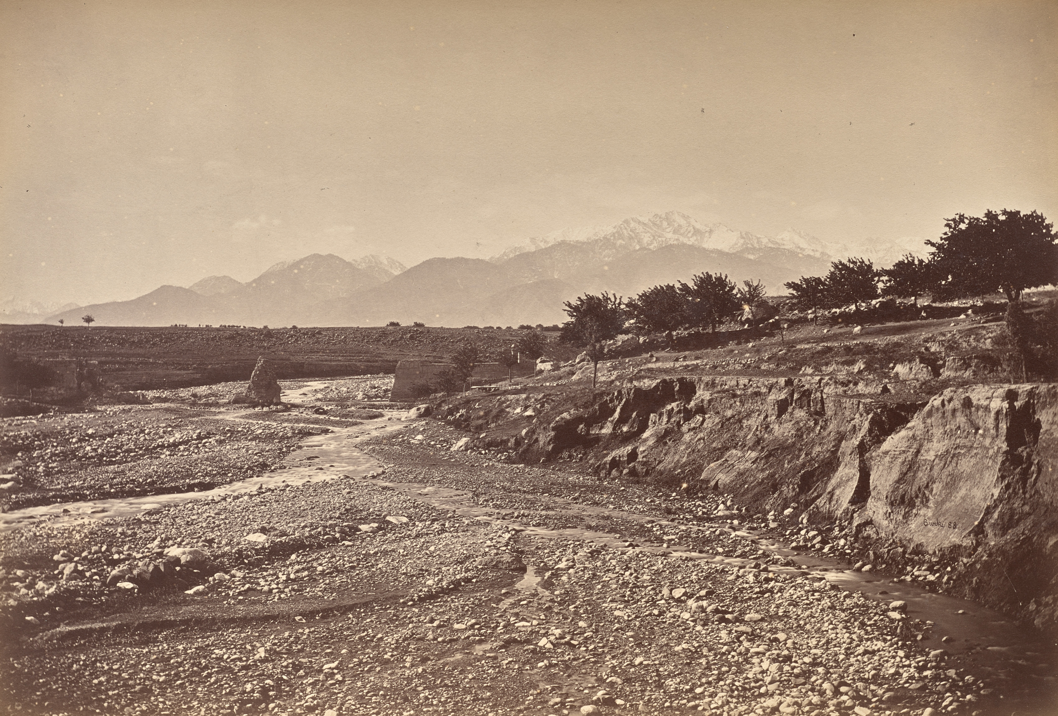 Sepia-toned photograph of a rocky riverbed with a low, rocky cliff on the right. The riverbed is dry and cracked in some areas, with small rocks and pebbles scattered throughout. A few trees are visible on top of the cliff on the right. In the background, there are mountains with snow-capped peaks. An old bridge with multiple arches spans the river in the distance on the left. The sky above is hazy. The image is titled "Safed Sang River and Old Bridge" by John Burke.