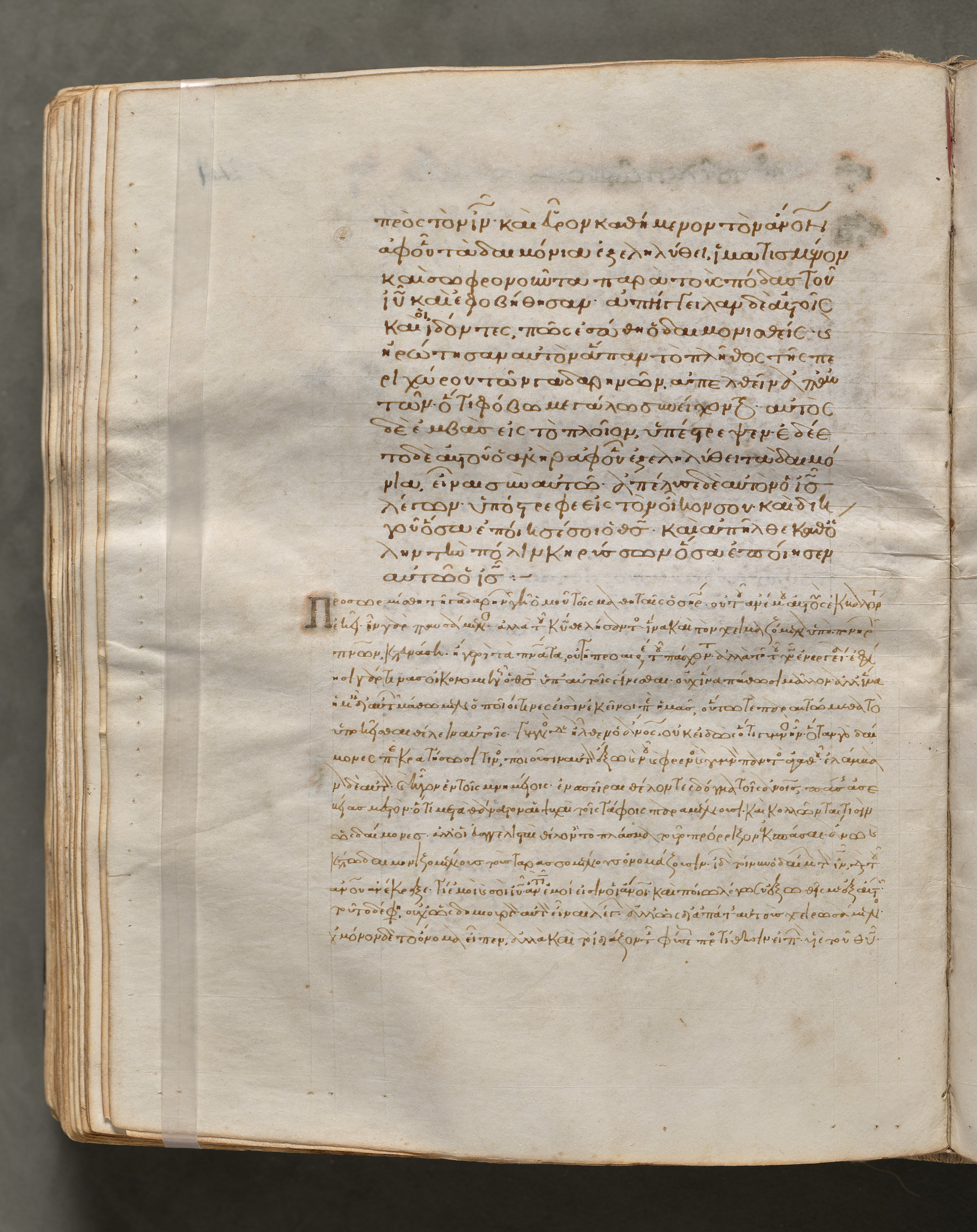 A yellowed, aged book page made of parchment or similar material, with a vertical line down the left indicating it was bound. Right side of the page displays two columns of text written in gold ink, with the top half more densely filled. The bottom half contains a single column of text. A large gold initial 'Π' is visible, and there are darker spots and discoloration throughout. The left side of the page shows signs of aging with darker edges and spots, while the background behind the book is gray.