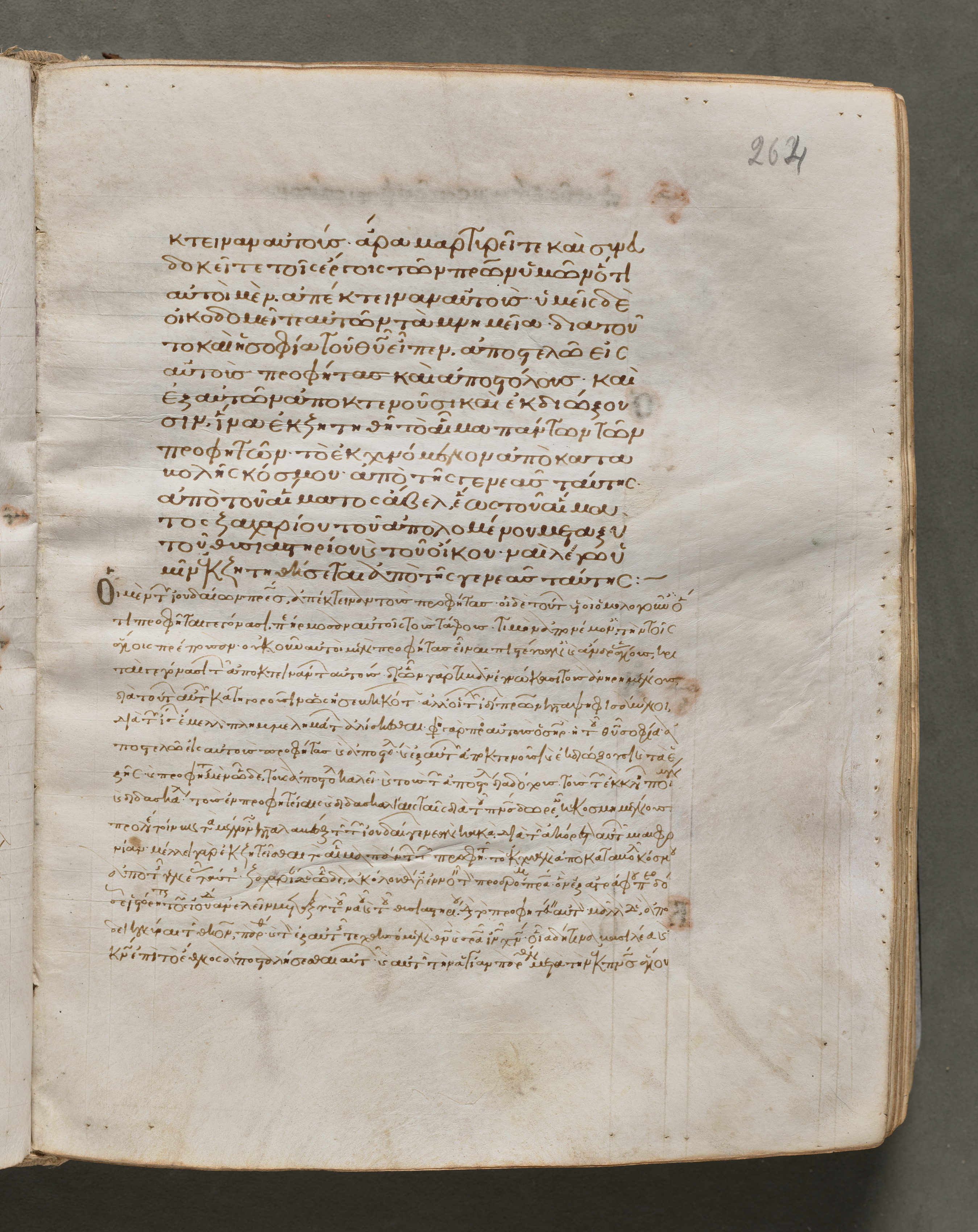 An open book with yellowed pages displays a dense block of Greek text written in brown ink. The left page has a small number written at the top right corner: "264". The top portion of the page contains less text, while the bottom portion features more text. Stains and discoloration are visible on both pages. The pages exhibit signs of wear along the edges. The book is set against a dark grey background.