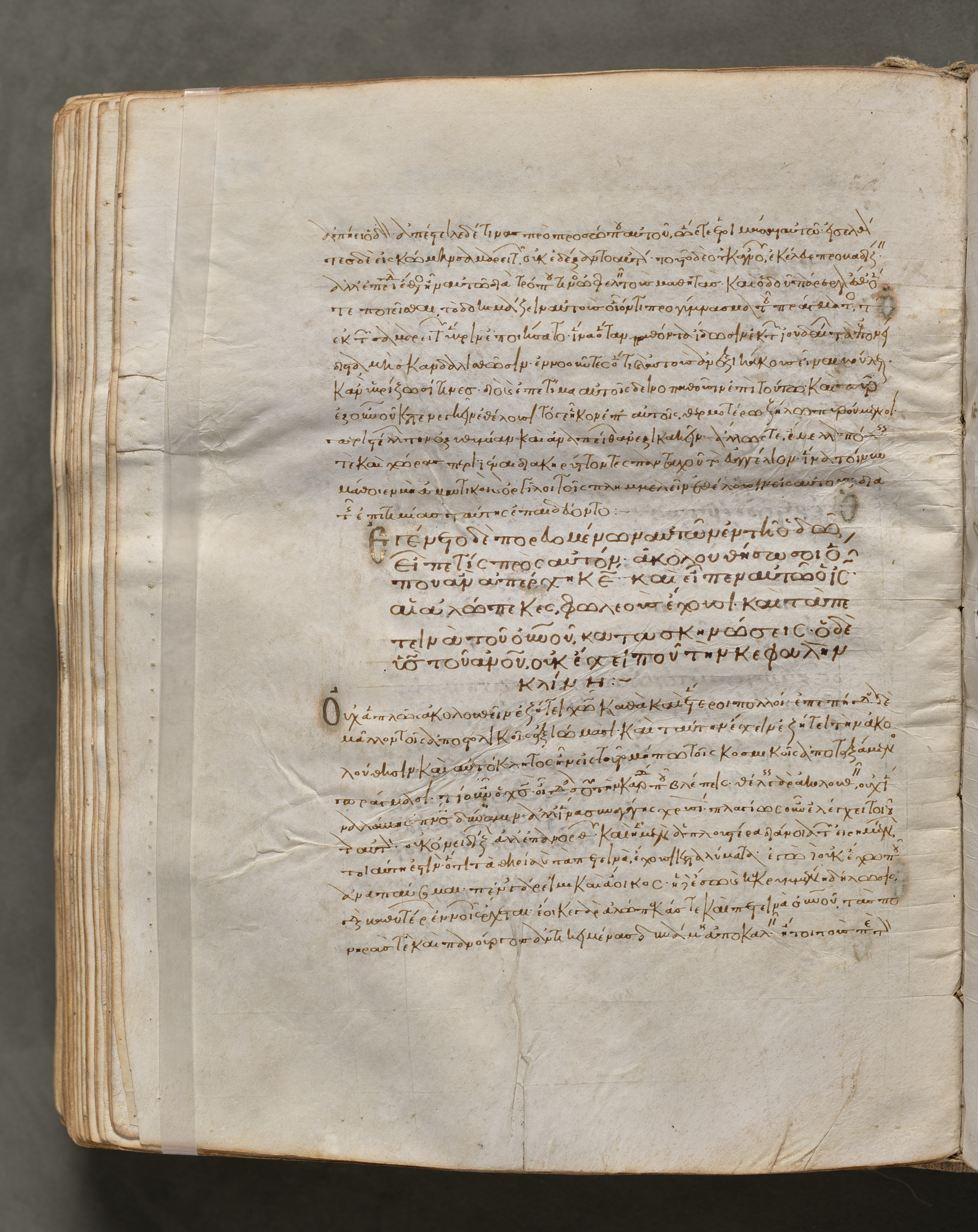 Folio 251, verso, from a Gospel Book with Commentaries. A page from an old book, displayed on a stand, showing the right side of the opening with a strip of tape down the spine; the left side is filled with text in brown ink in a hand that slants right.