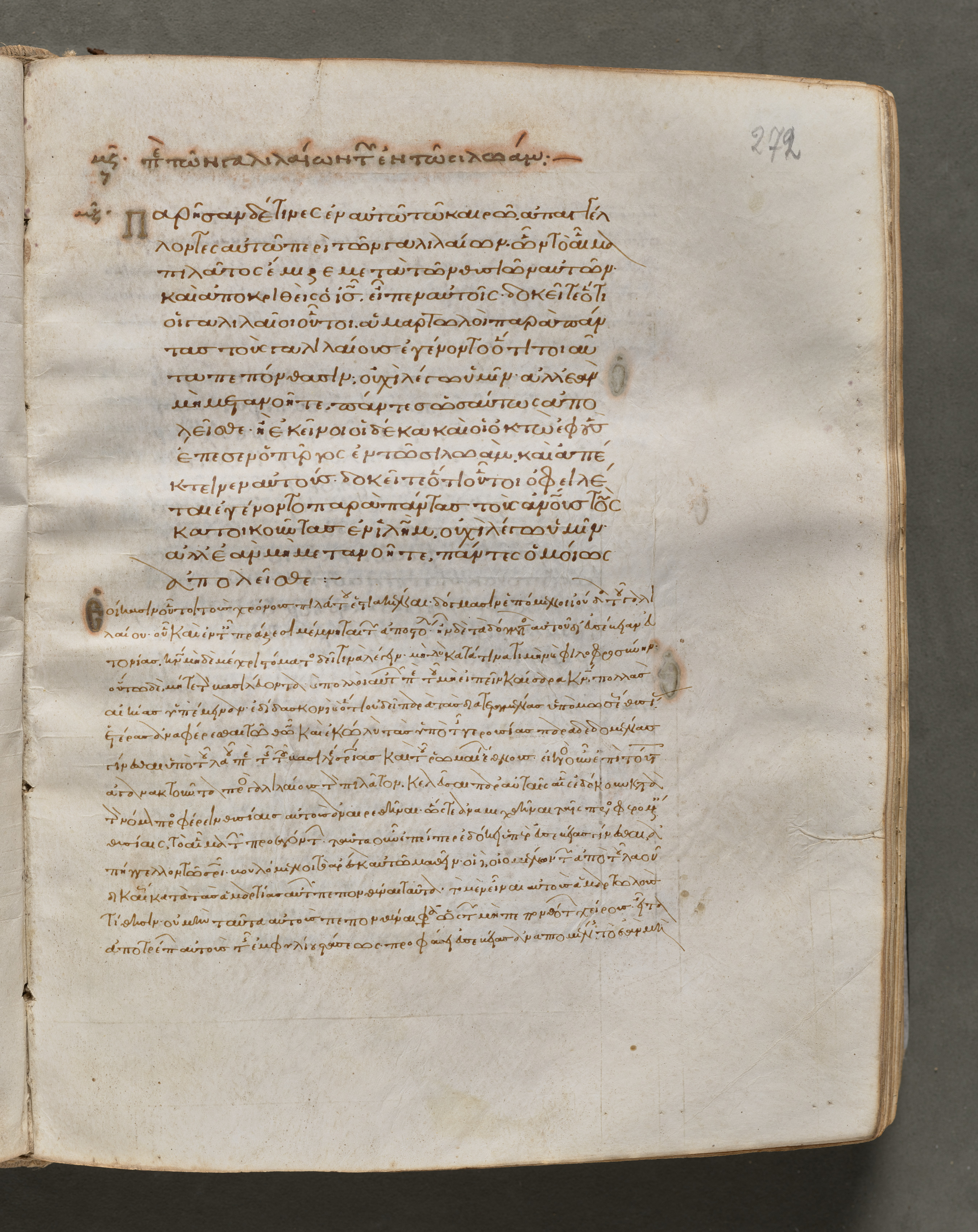 Open book with yellowed pages. The page shown has a number '272' in the upper-right corner and a heading line in red ink. The rest of the text on the page appears to be written in brown ink and a foreign language, likely Greek. Dark spots are on the page. The book lies on a dark gray surface.