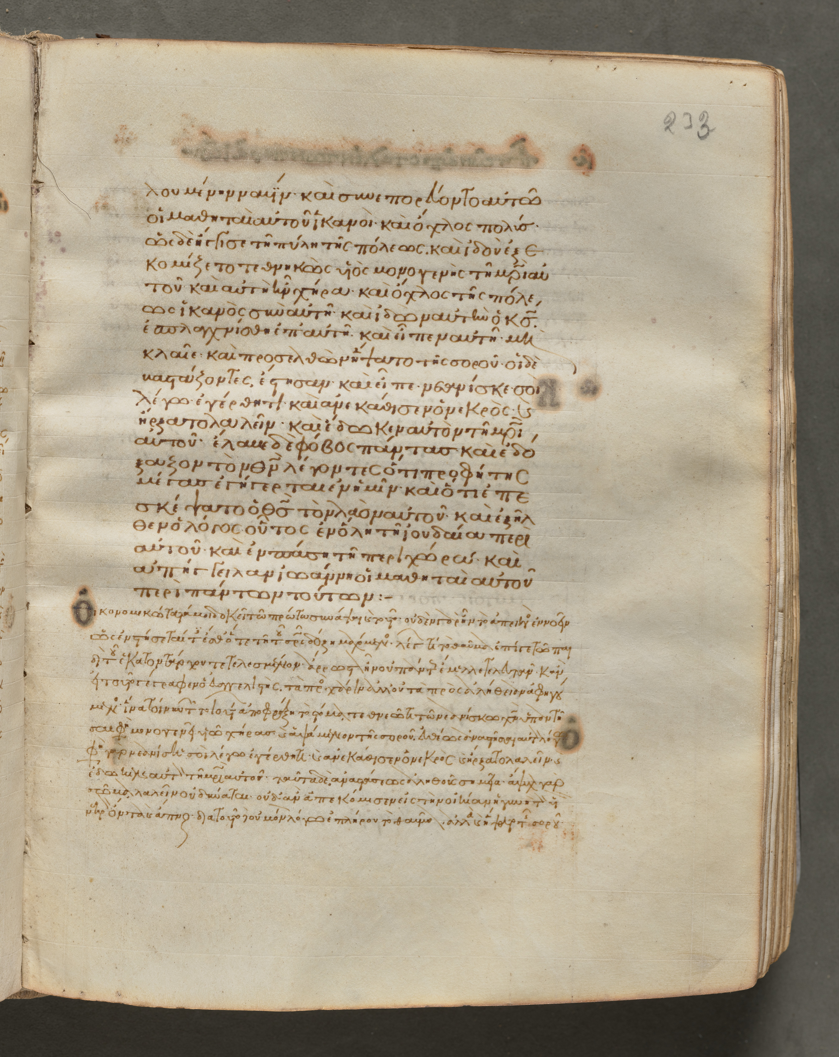 Open book with yellowed pages, visible text written in Greek, page number 233 in top right corner, darker spots and discoloration on pages.