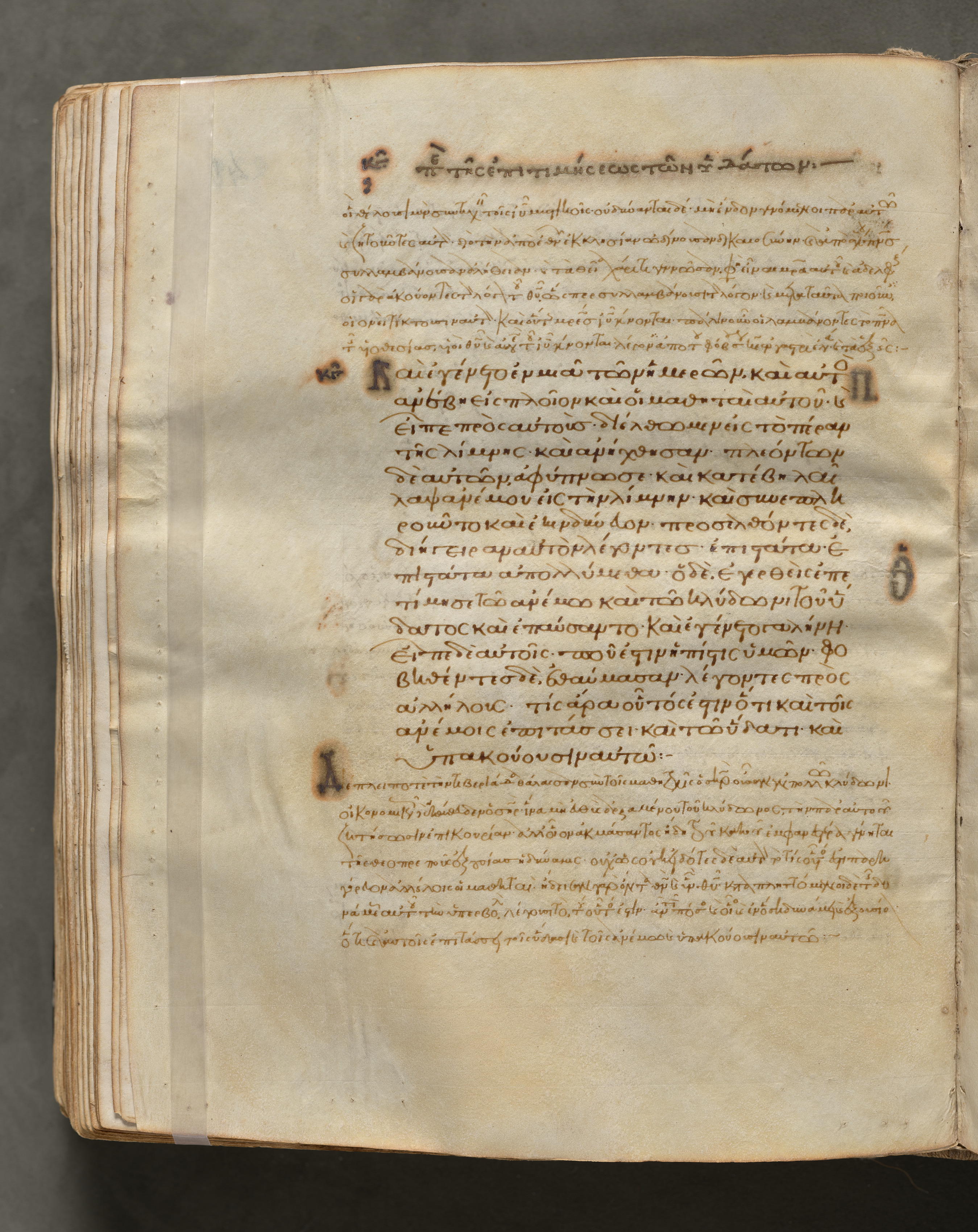 An open book with yellowed pages displays a page filled with handwritten text in an ancient language, likely Greek. The book's cover is not visible; the pages are yellowed and worn, with darker edges and spots of damage. The text on the page appears to be written in a flowing script, with no illustrations or images present. A strip of tape holds the book open on the left side. The background behind the book is a dark grey color. For an image with "Gospel Book with Commentaries" as the title and the verso side of folio 240 displayed, the verso side displays the end of a section and the beginning of another.