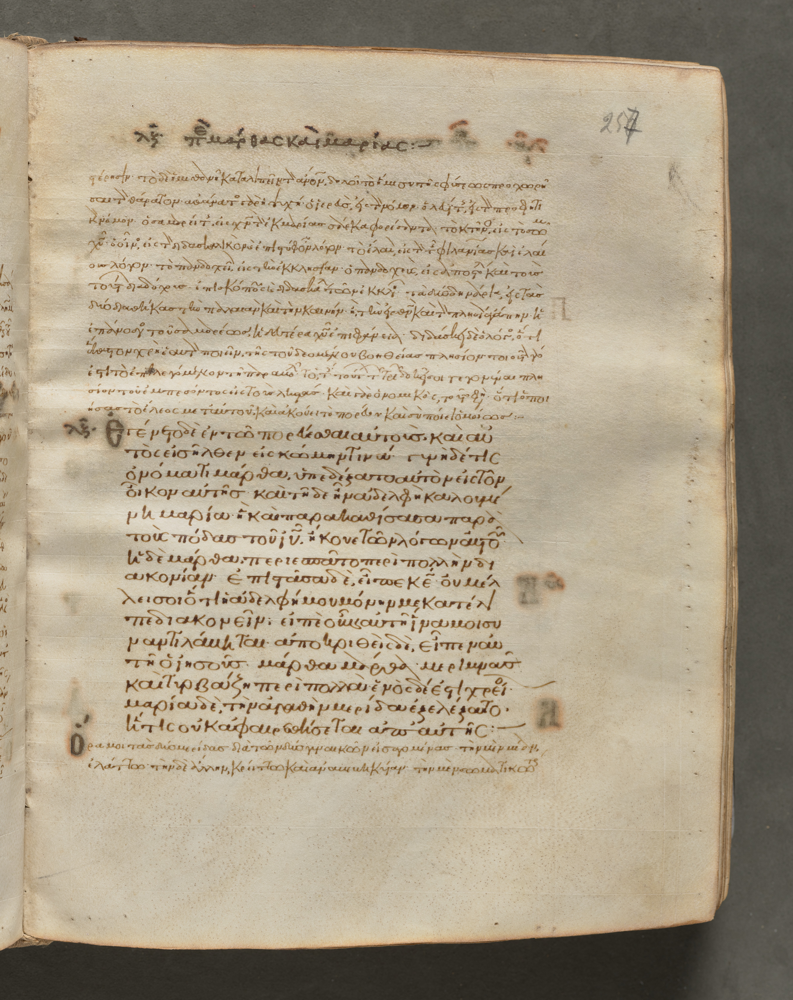 Open book with yellowed pages, brown ink text in a language that uses Greek alphabet, right page has number "257" in top right corner, text arranged in paragraphs, darker brown spots and discoloration on pages, edges of pages worn and brown.