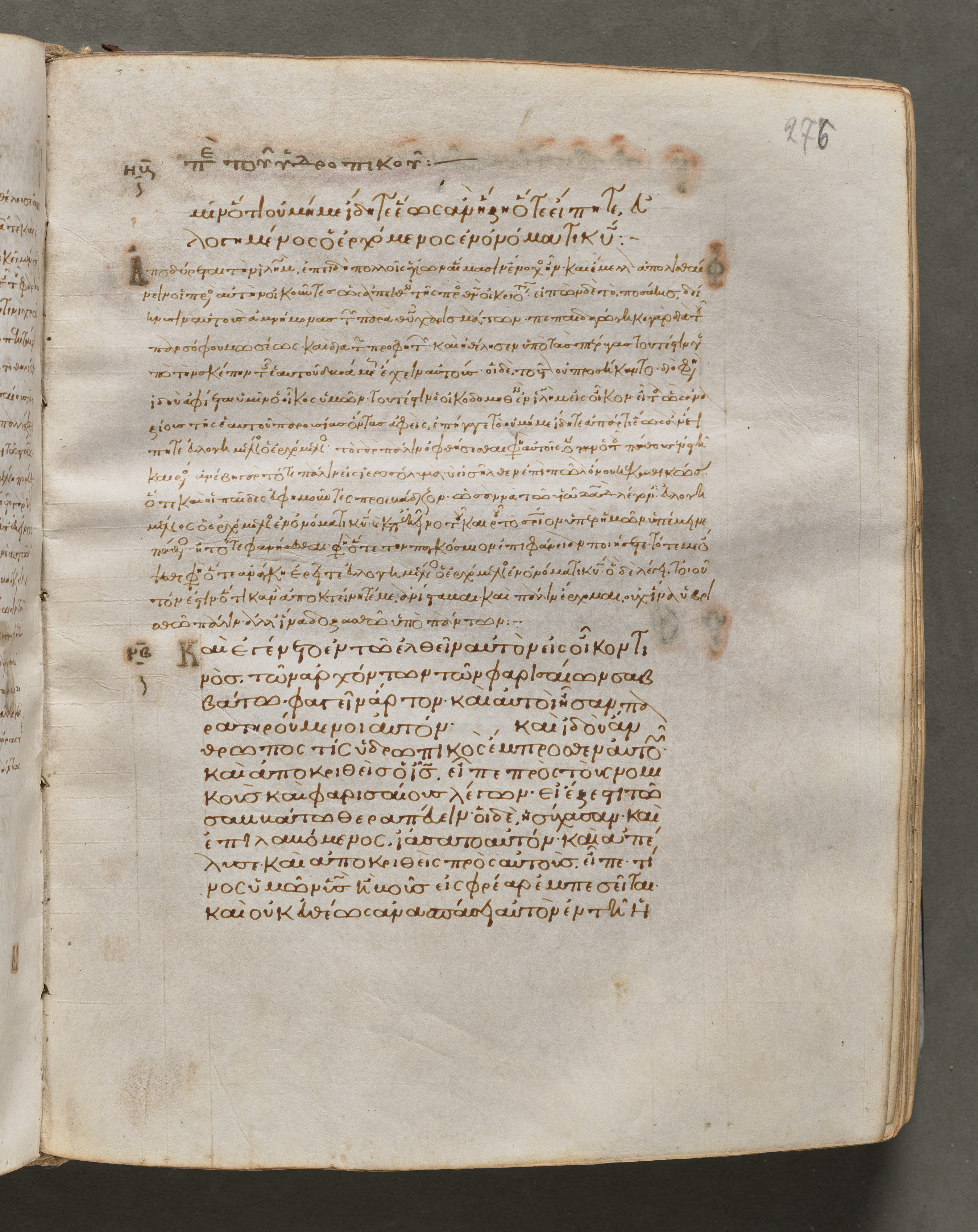 Open book with yellowed pages, brown ink writing in a language that appears to be Greek, on a dark gray background. The book's pages are turned to folio 276 recto. Text is handwritten in a formal script. The majority of the page is filled with text, with some blank space at the top and bottom. A small number "276" is written in the top-right corner. The left page edge is partially visible, showing more text. The book appears old and worn, with visible signs of aging and use.