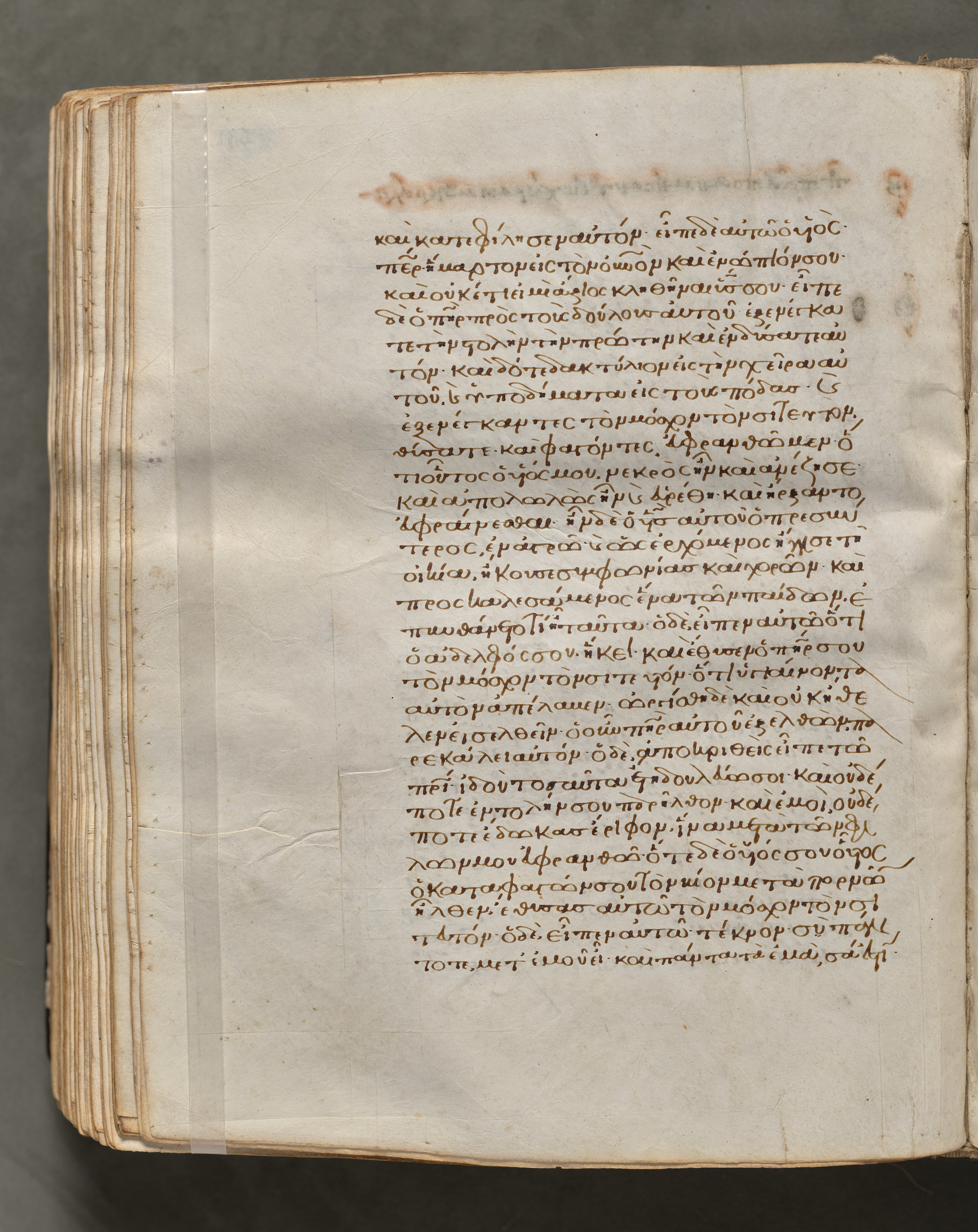 A page of book. The book is open with the right side showing. The book's pages are old and yellowed. The pages are bound on the left side. A crack runs vertically down the center of the page on the right. Greek writing in brown ink fills most of the right page. A translucent tape strip crosses the bottom left corner. Discoloration and staining appear on the top and edges. The background behind the book is grey.