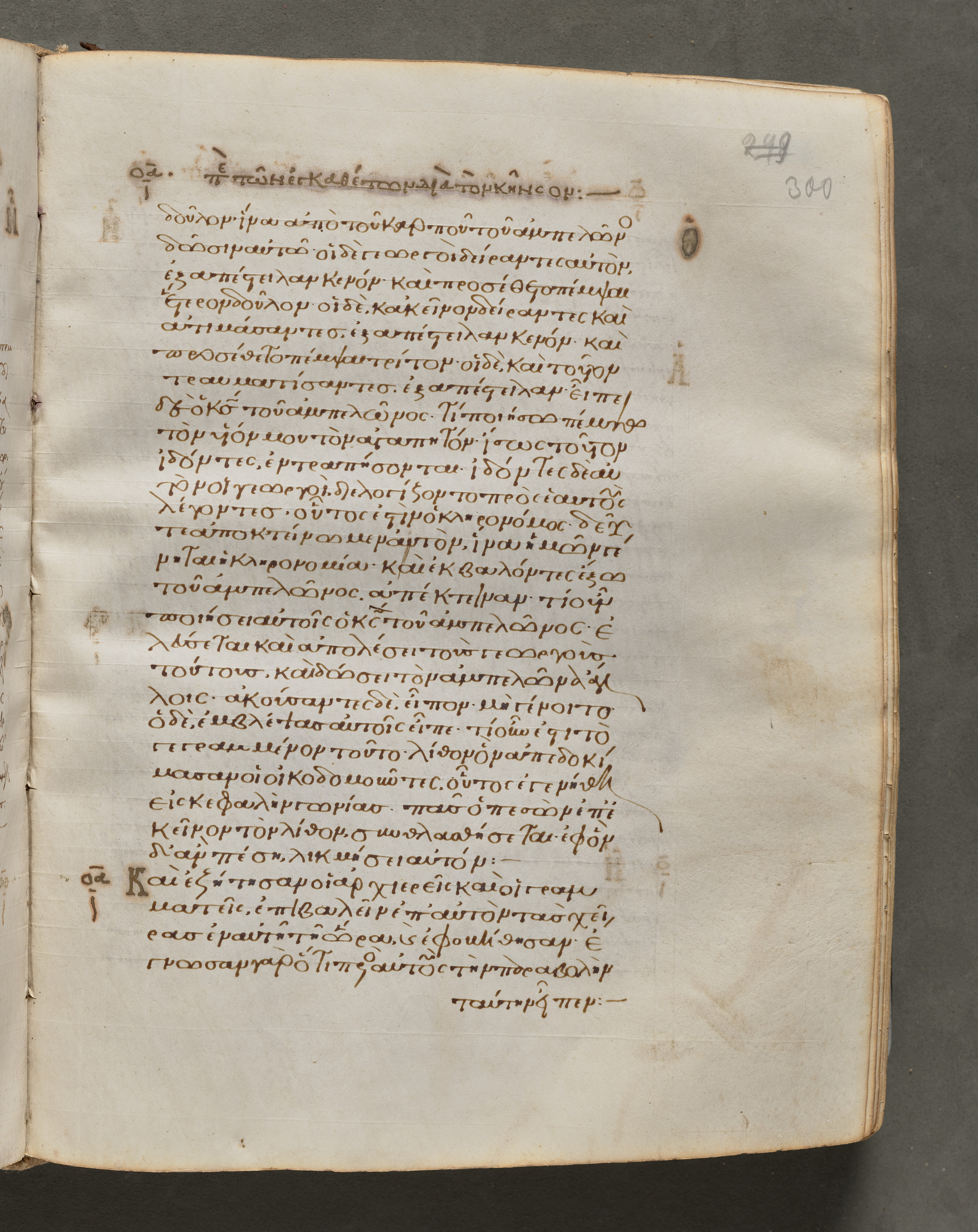 Open book with yellowed pages, brown ink text written in a language that appears to be Greek, two small numbers "249 300" written in blue ink in the top right corner.