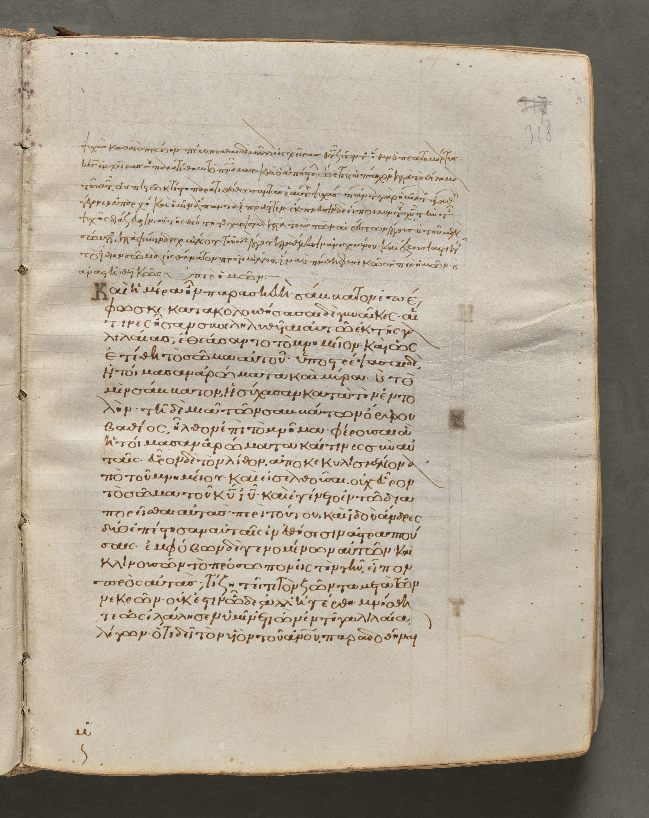 Open book with yellowed pages, featuring brown ink text written in a language that appears to be Greek. The page number 318 is visible in the top right corner. The text is handwritten in a flowing script, occupying most of the page. The book's cover is not visible, but the pages exhibit signs of aging, including discoloration and wear along the edges. The background is dark gray.