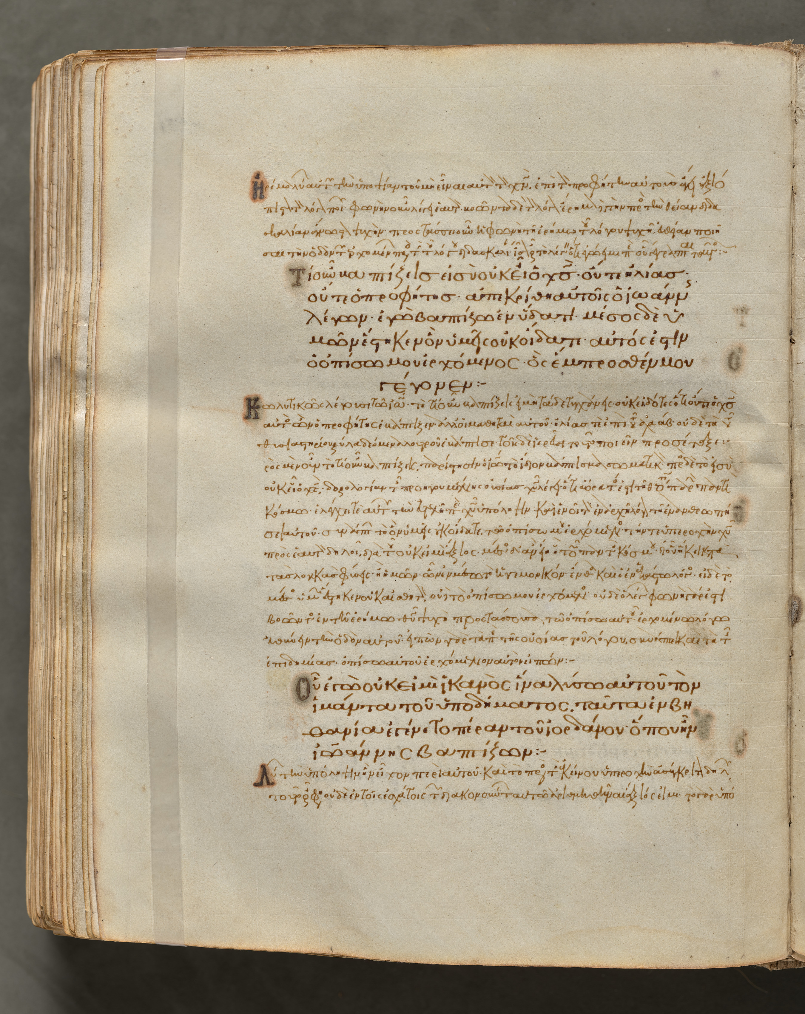 Open book with yellowed pages. The book's pages are yellowed and feature brown text written in a language that uses the Greek alphabet. The text on the pages appears to be written in a formal, cursive script. There are two columns of text on the right page. The left page is not visible. The edges of the pages are worn and brown. A translucent tape strip is affixed vertically to the left of the text. The book is positioned on a dark surface with a shadow visible beneath it.