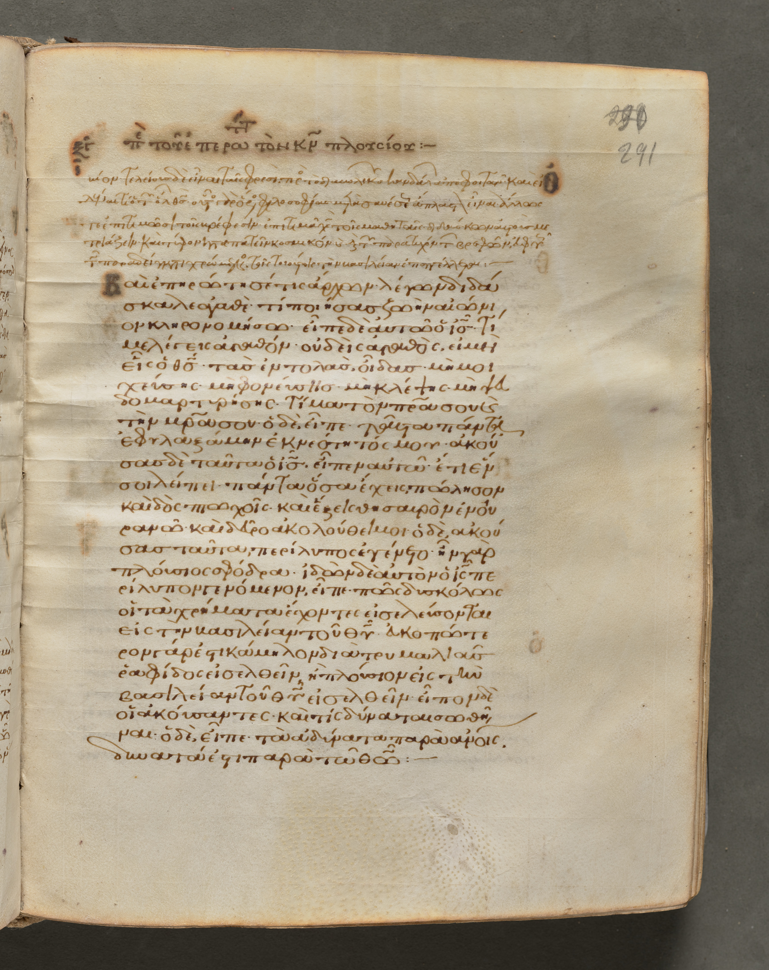Open book with yellowed pages, brown text written in a language that appears to be Greek, two small brown stains at the top, and a handwritten number "291" in the upper right corner.