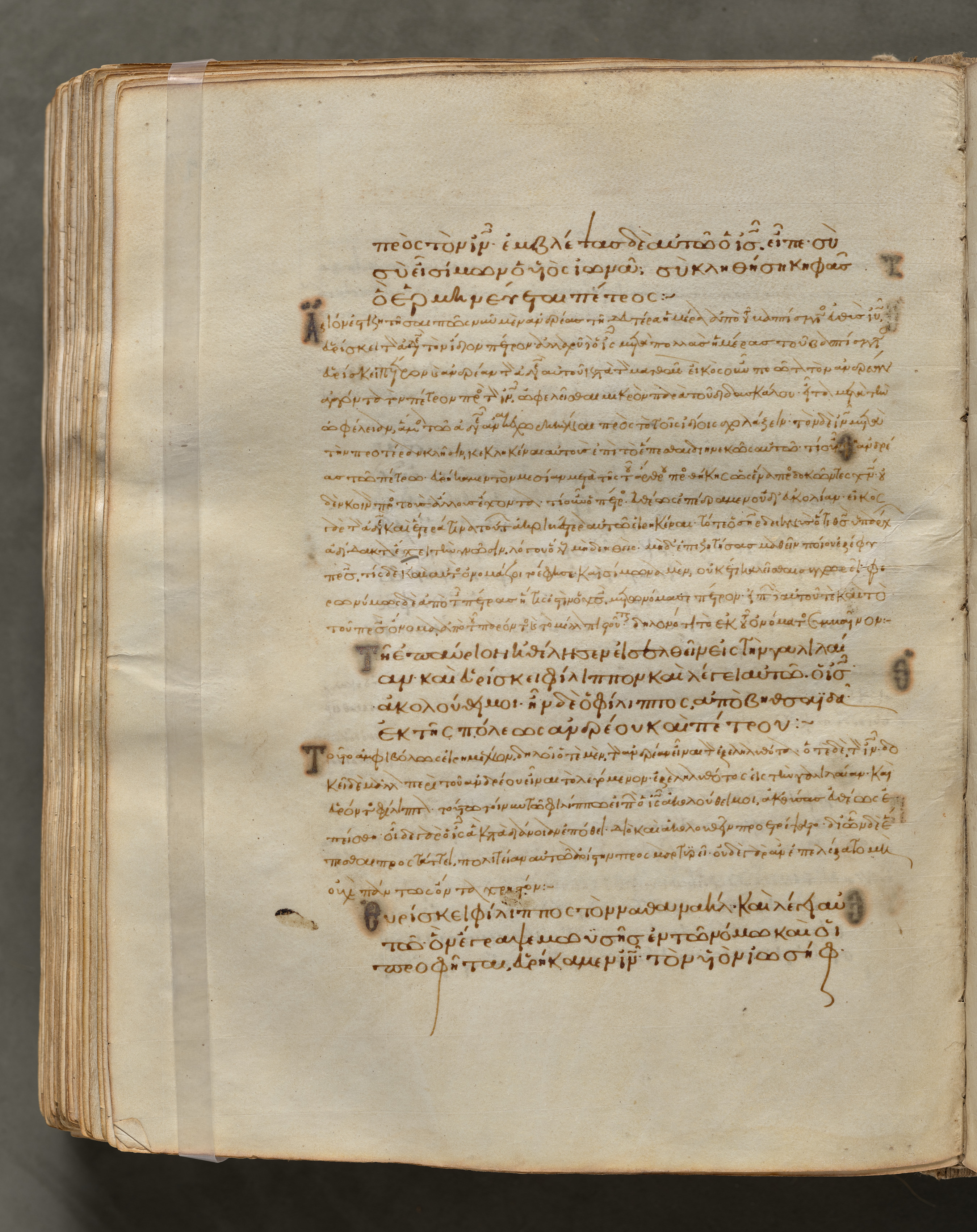 Open book with yellowed pages, brown text written in a language that uses Greek alphabet, text arranged in paragraphs, some darker spots and stains on pages.