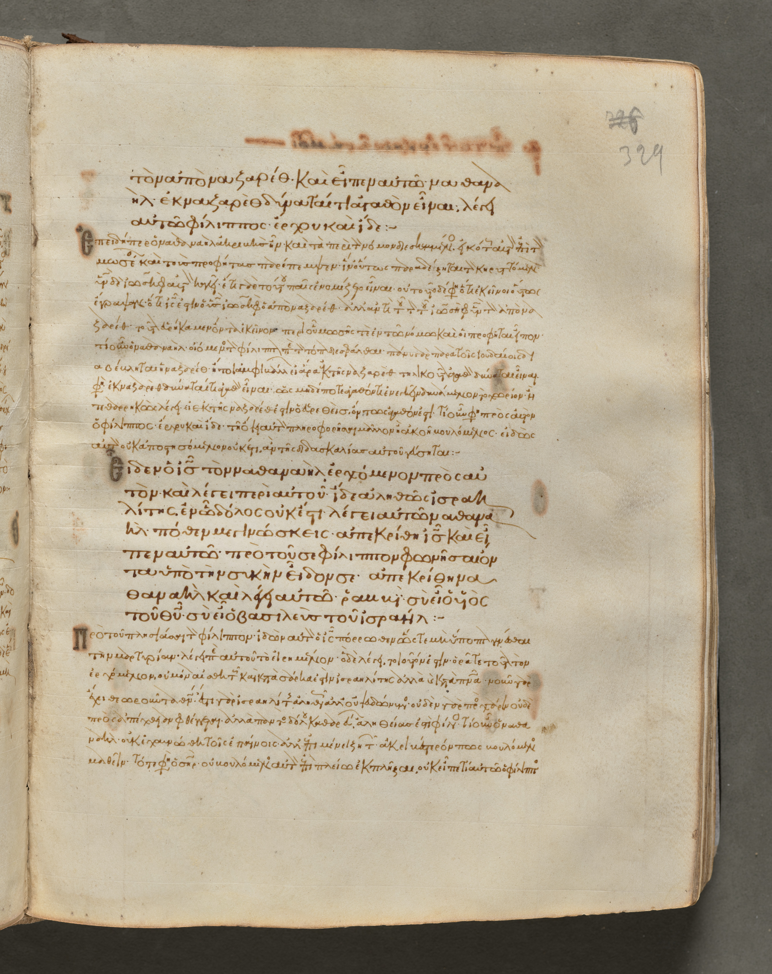 Yellowed, aged book page with brown text written in a language that uses Greek alphabet; page number "329" handwritten in upper right corner; darker marks on page; book lying open on dark surface. The text, folio 329 (recto), from a Gospel Book with Commentaries.