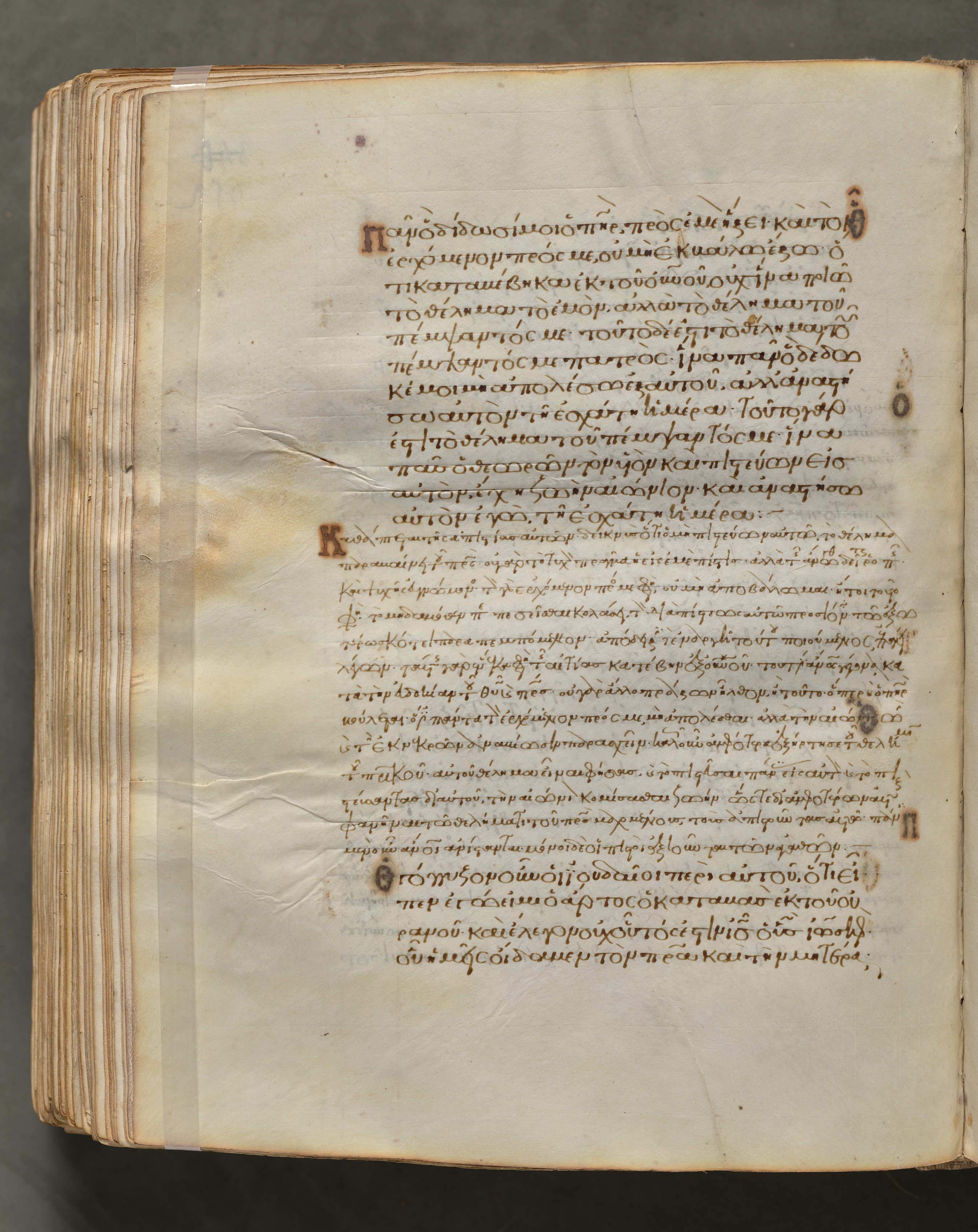 A Gospel Book with Commentaries, folio 352 verso, featuring yellowed parchment pages with brown ink text written in Greek, occupying most of the page with no images. The text consists of multiple lines arranged in a single column with several large, decorative letters. The book's cover is not visible; instead, the focus is on the open book displaying the text on the right page. A strip of clear tape holds the pages together along the left edge. The background is dark gray.