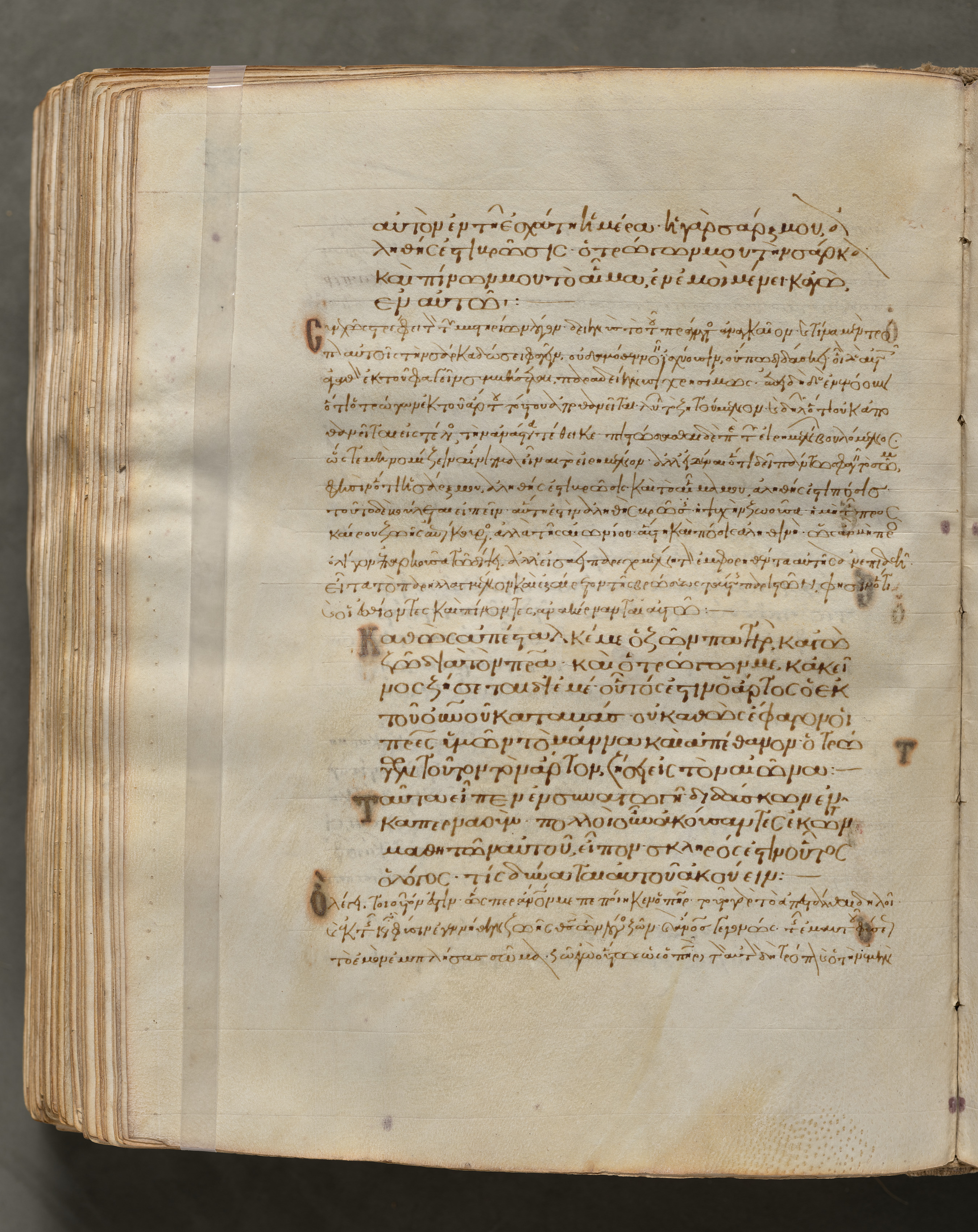 An open book with yellowed pages contains many lines of small, brown writing in a language that uses Greek letters, likely Greek. The book's cover is not visible. A piece of clear tape runs along the left edge of the book. Stains are visible on the pages. A gray background is behind the book.