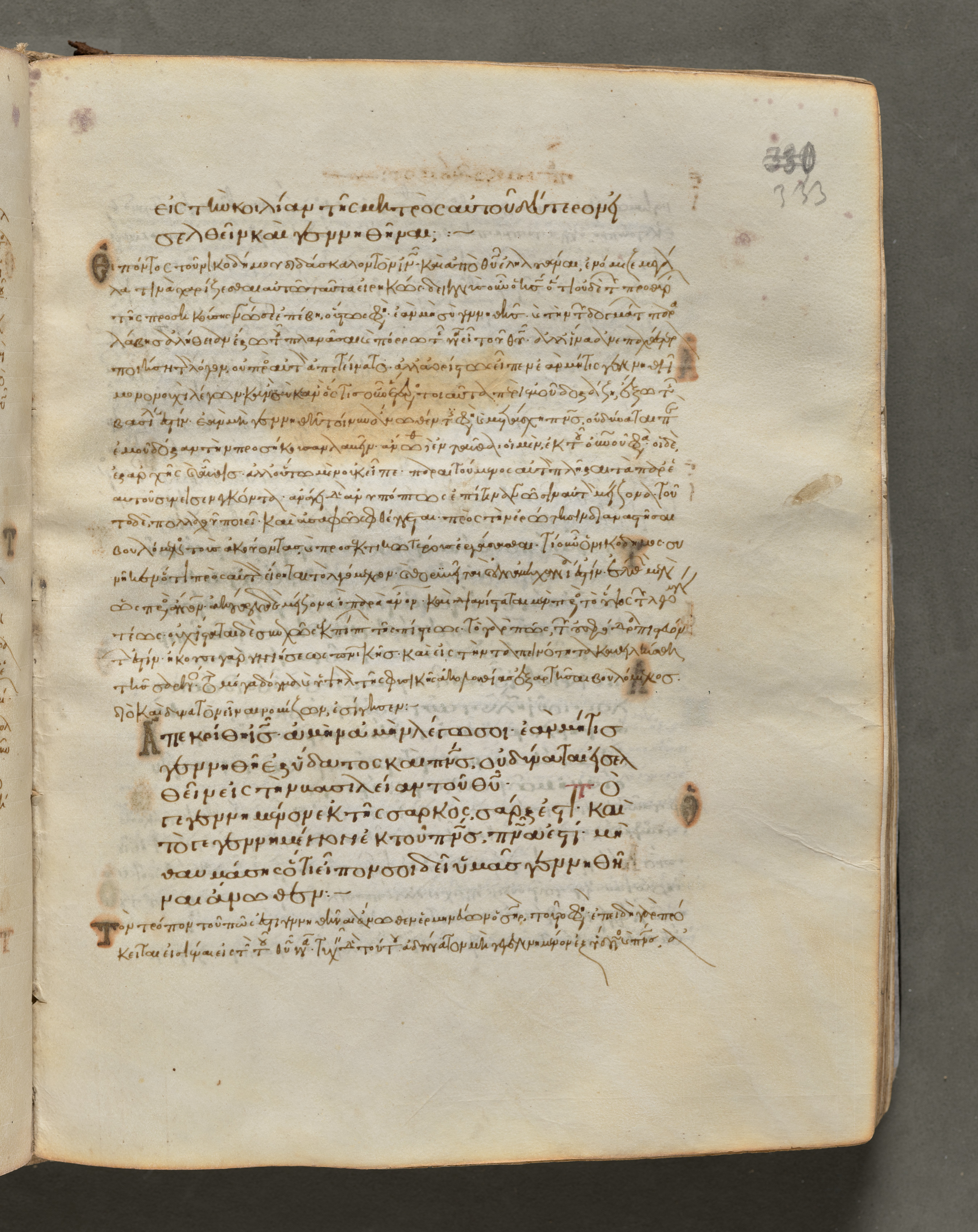 Open book with yellowed pages on a gray background, featuring handwritten Greek text in brown ink on both sides of the left page and on the right page, mostly illegible; brown ink splotches on the left side; small black and white head illustration on the top left; page number 333 written on the top right; some stains visible; the text appears to have been written in a medieval script; gold-colored wear on edges; right page edge uneven.