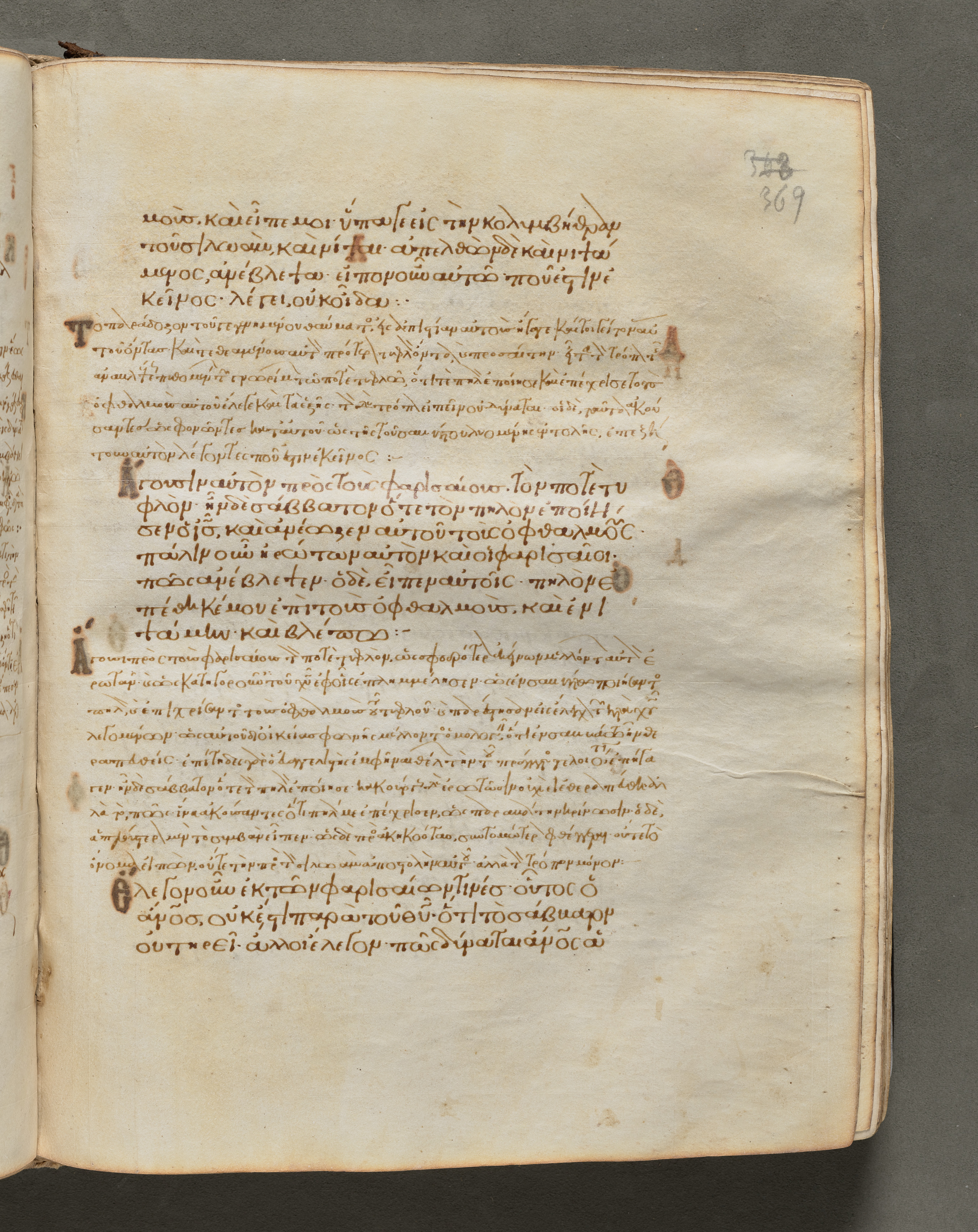 Yellowed, aged book open to a page with Greek writing in brown ink. The page number "369" is written in the top-right corner. The book's cover is not visible, but the pages are slightly curled and have a worn appearance. The text is written in a formal, cursive script and is divided into sections with decorative initials. The background of the image is a dark gray color.