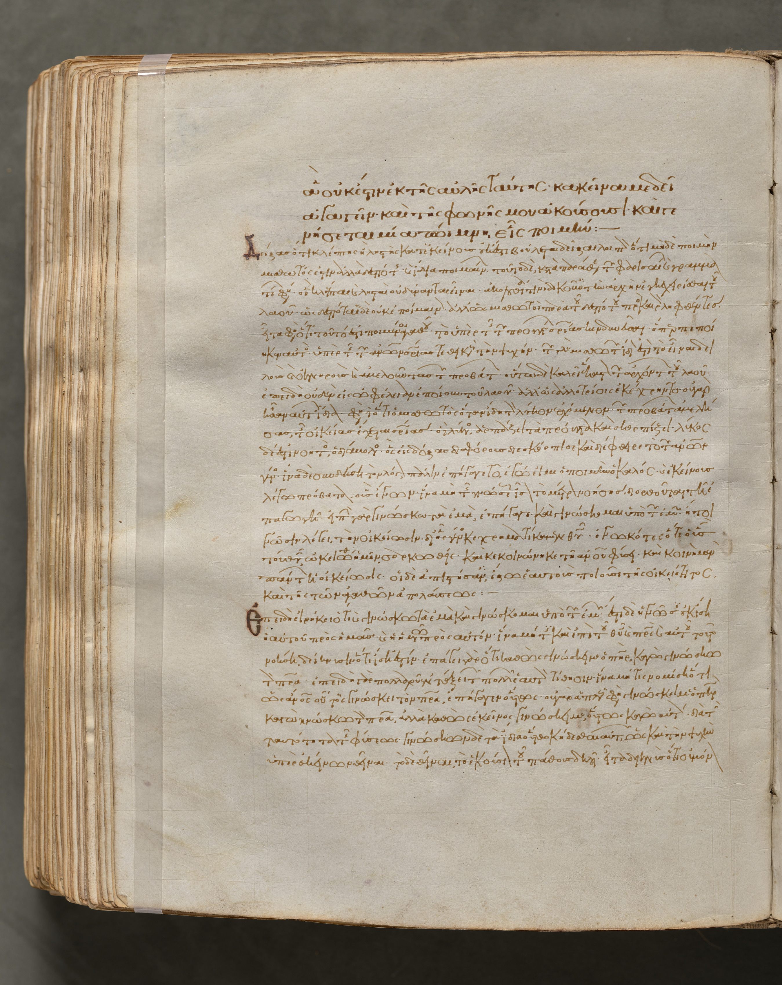 Open book with yellowed pages, brown ink writing in a language that uses Greek alphabet, 2 columns of text on one page, darker brown ink used for some letters, translucent tape on spine holding pages together, against a gray background.