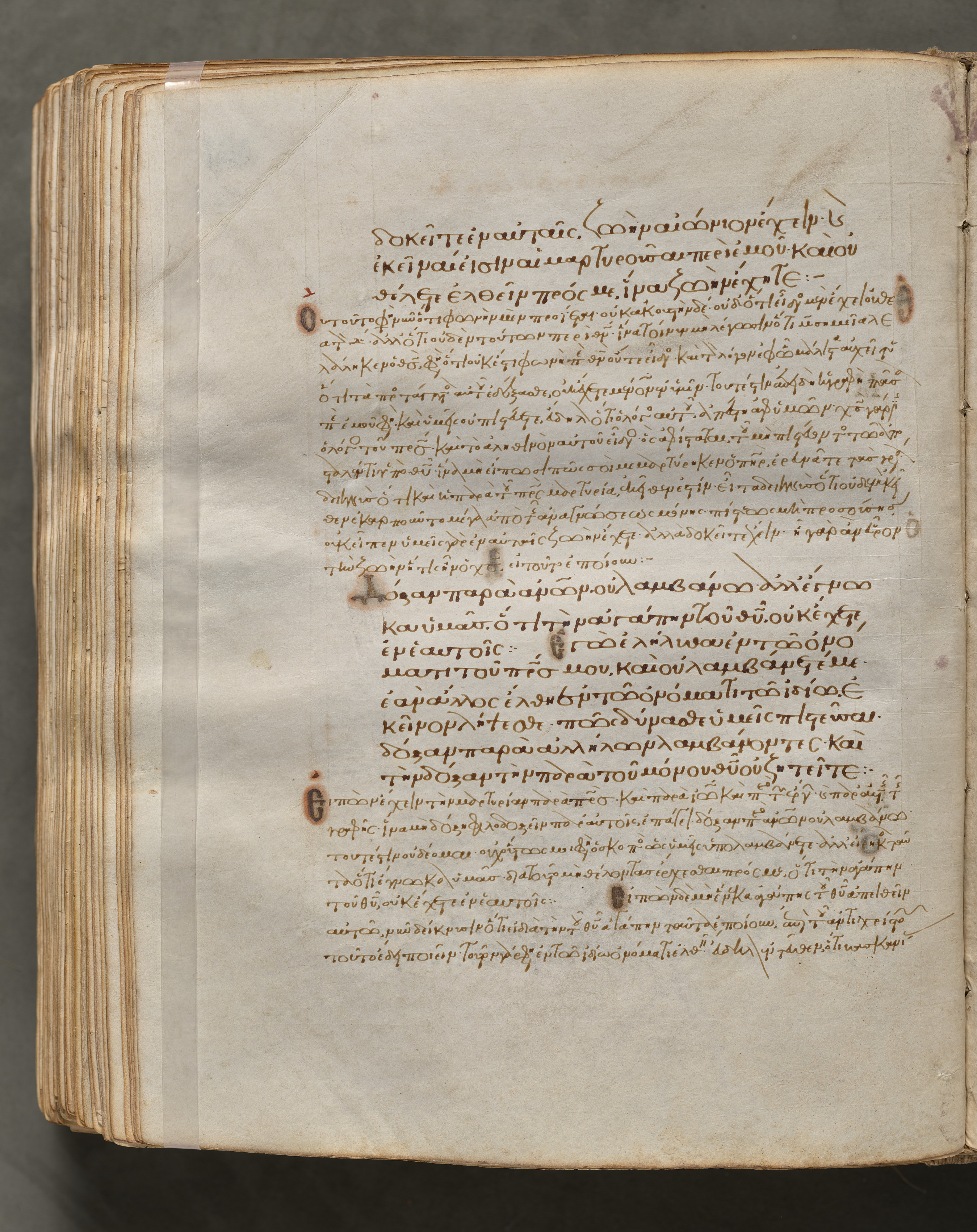 The image shows an open, aged book with yellowed pages. The book's cover is not visible. The left side of the book has a worn, darker brown spine with lighter brown and off-white pages. A strip of clear tape holds the pages in place on the left. The right page displays brown ink text written in a language that appears to be Greek. The text is arranged in paragraphs and is written in a flowing script. There are dark brown spots and discolorations on the page. The background behind the book is dark gray. The book appears to be an old, possibly medieval, manuscript. The text, folio 347 (verso), is from a Gospel Book with Commentaries.
