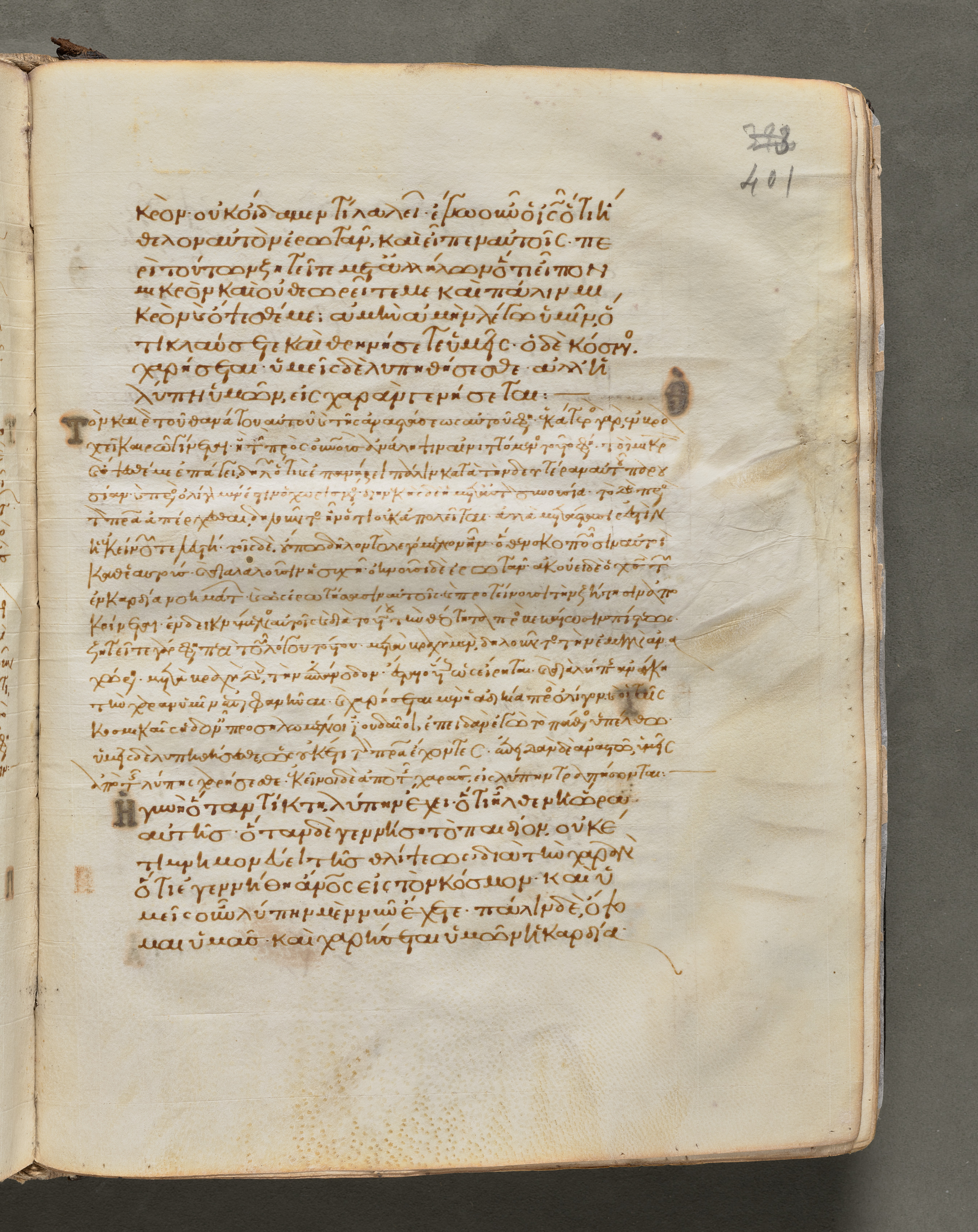 Open book with yellowed pages, brown ink writing in a language that appears to be Greek, writing on one page, stains on the pages, number "401" written on the upper right corner.
