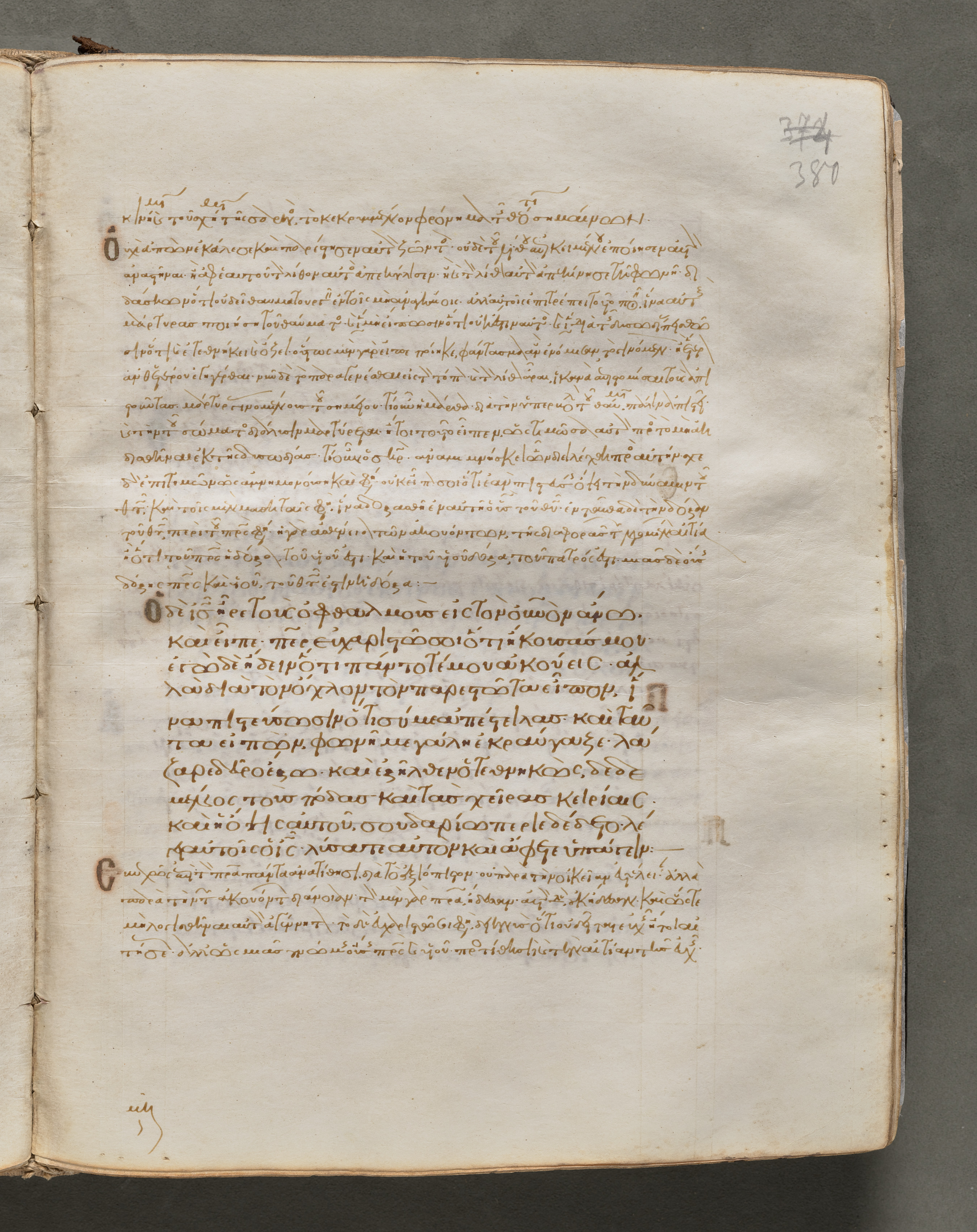 Open book with yellowed pages on a dark grey background. The left page is not shown. The right page displays two columns of handwritten text in brown ink. At the top right corner, a small number '380' and '381' are written. The book's cover is not visible. The text is written in an ancient language, likely Greek. The script is cursive. The pages have visible signs of aging and wear. The edges of the pages are rough and yellowed. The background is a solid dark grey color.