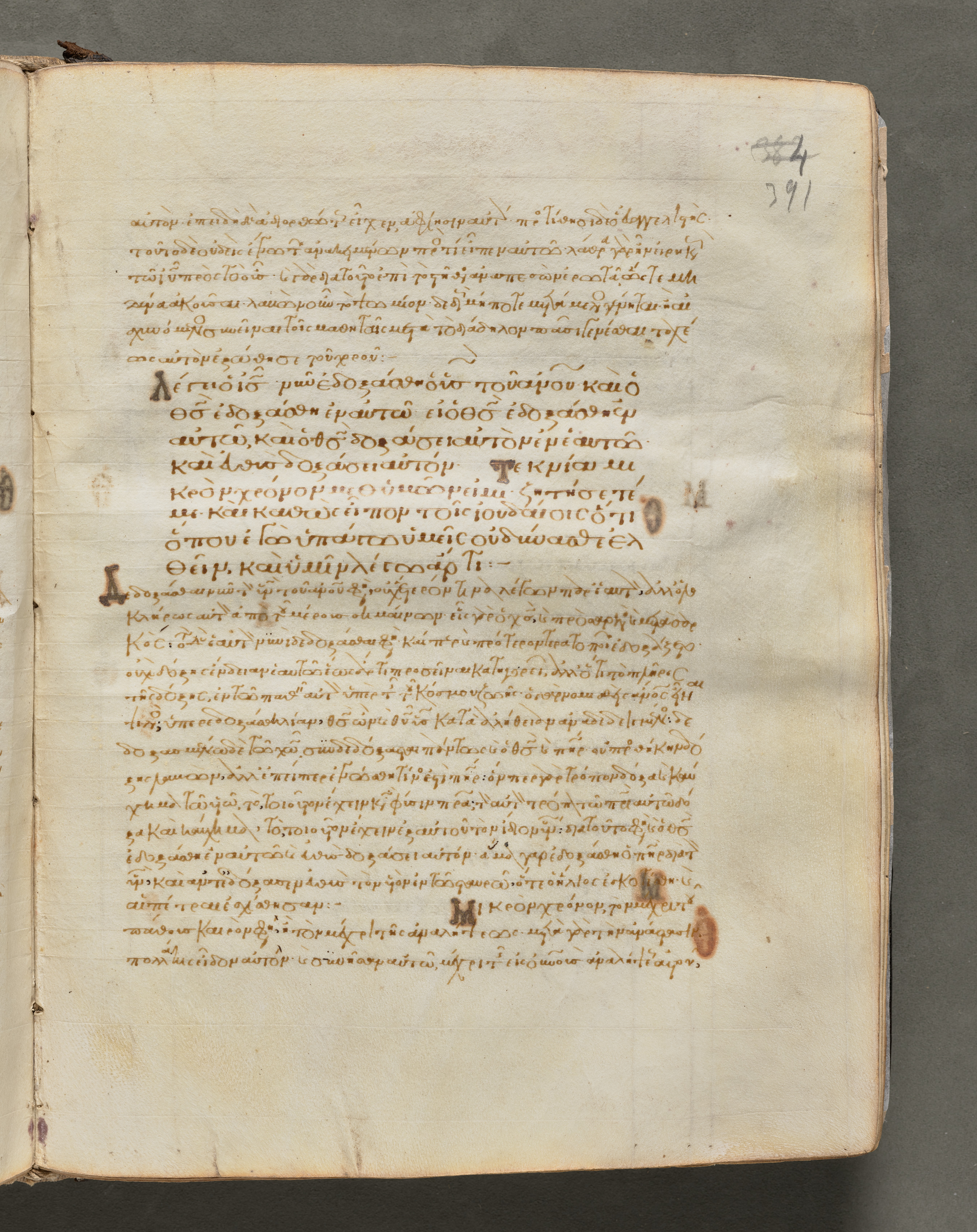 Open book with yellowed pages, brown ink writing in a language that appears to be Greek. The text is written in a flowing script, with some darker brown ink used for accents or corrections. Darker brown spots on the page. A number "391" is written on the upper-right corner.