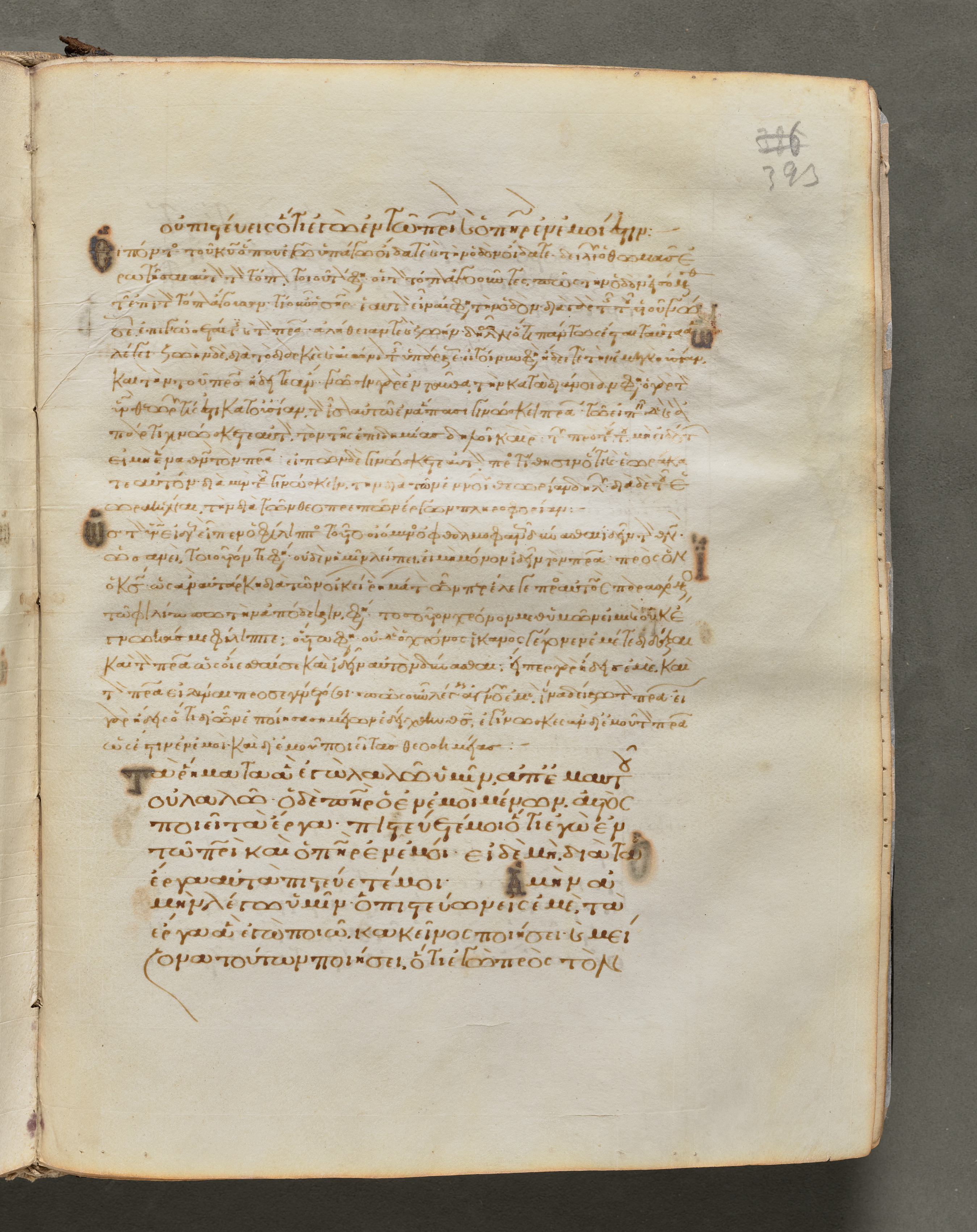 Yellowed, off-white page with brown writing in a language that uses Greek alphabet; brown ink; darker brown discoloration spots; small tears along edges; dark gray background; right page of a two-page spread; right top corner shows "#6 393"; three holes punched down left side; text divided into two columns.