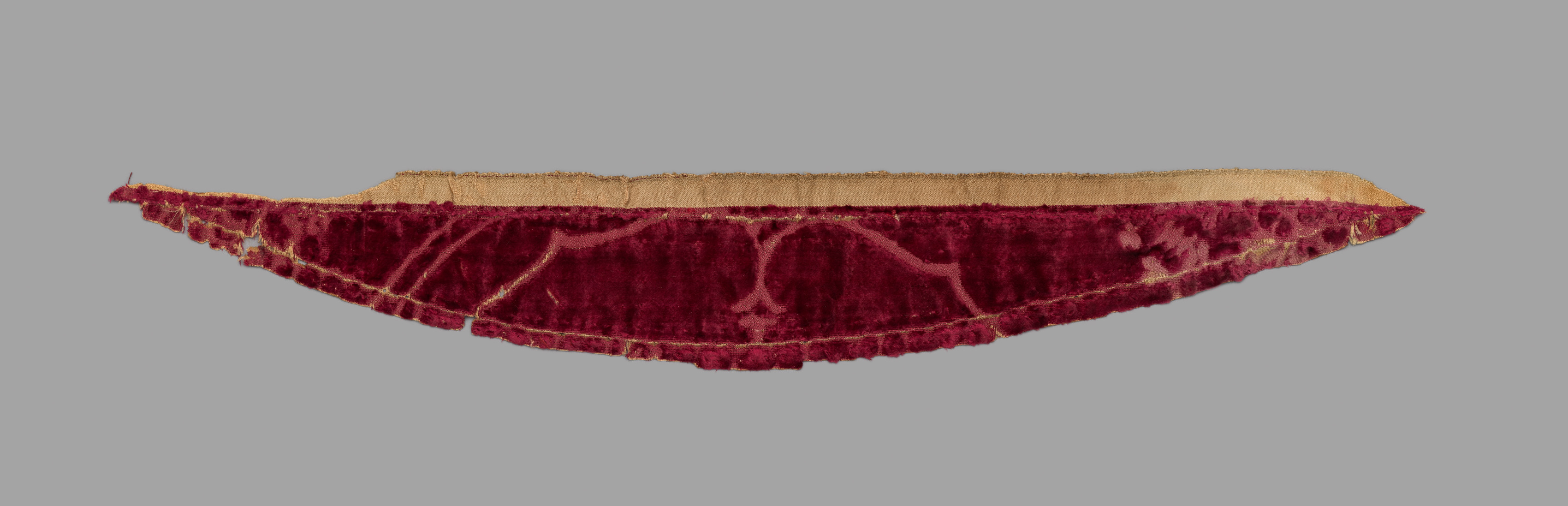 The image shows a piece of velvet cape. The piece is semi-circular in shape. The top portion is a light brown color. The bottom portion is a dark red velvet with a cream colored decorative stitching. The background is gray.