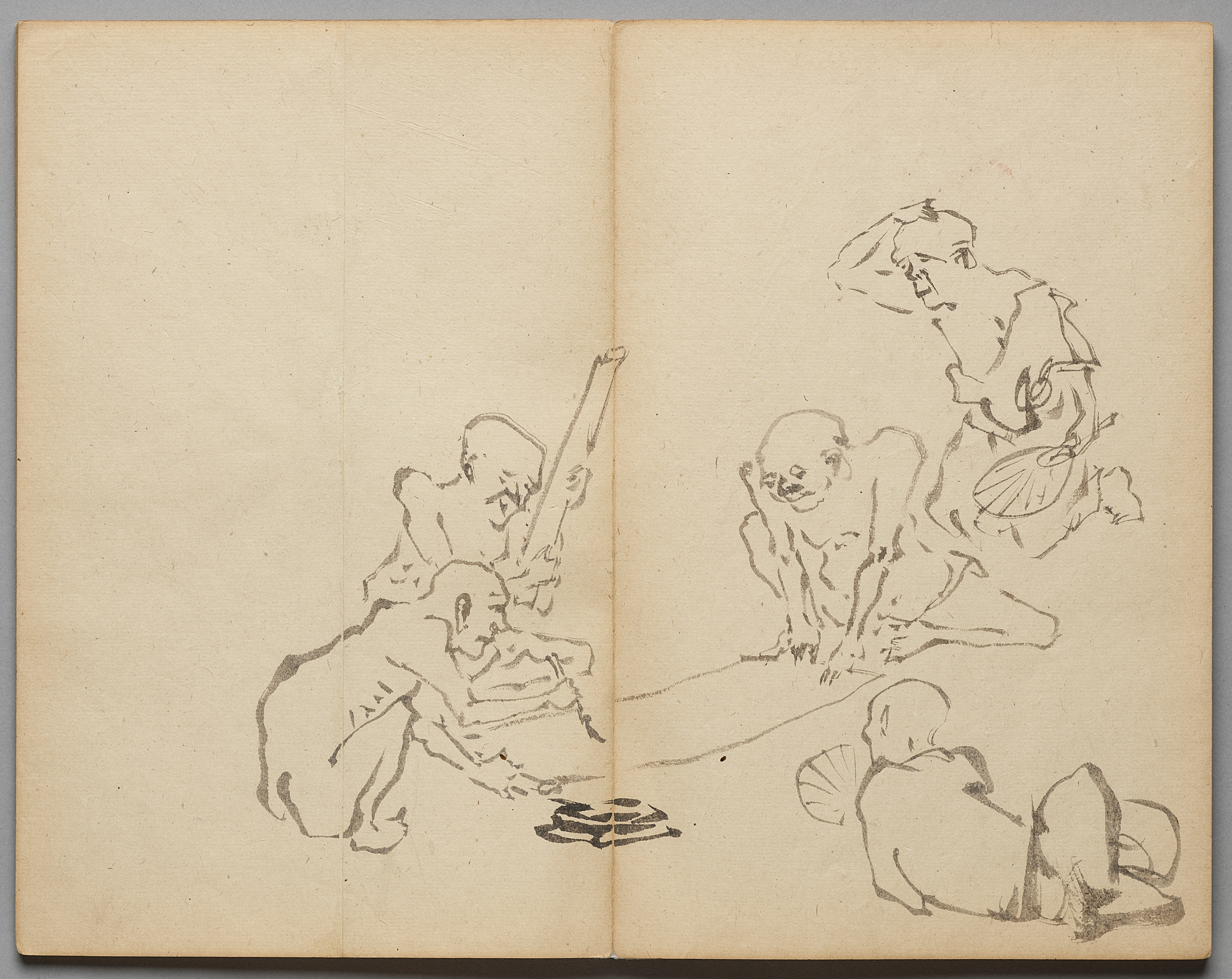 The image shows an open book with two pages featuring sketches of people. The pages are yellowed and have a rough texture. Four people are drawn on the pages, with one on the right side of the right page leaning forward with right hand on left shoulder, one on the bottom right sitting cross-legged with left hand on right knee and right hand to face, one on the center right sitting cross-legged and looking down, and one on the left side of the left page sitting on the ground with right arm raised and holding something. There is a stack of three round objects on the ground in front of the person on the left. The sketches are done in pencil or charcoal. The book is set against a gray background. The title is "Calligraphy in the Heat" and the artist is Kawanabe Kyōsai.