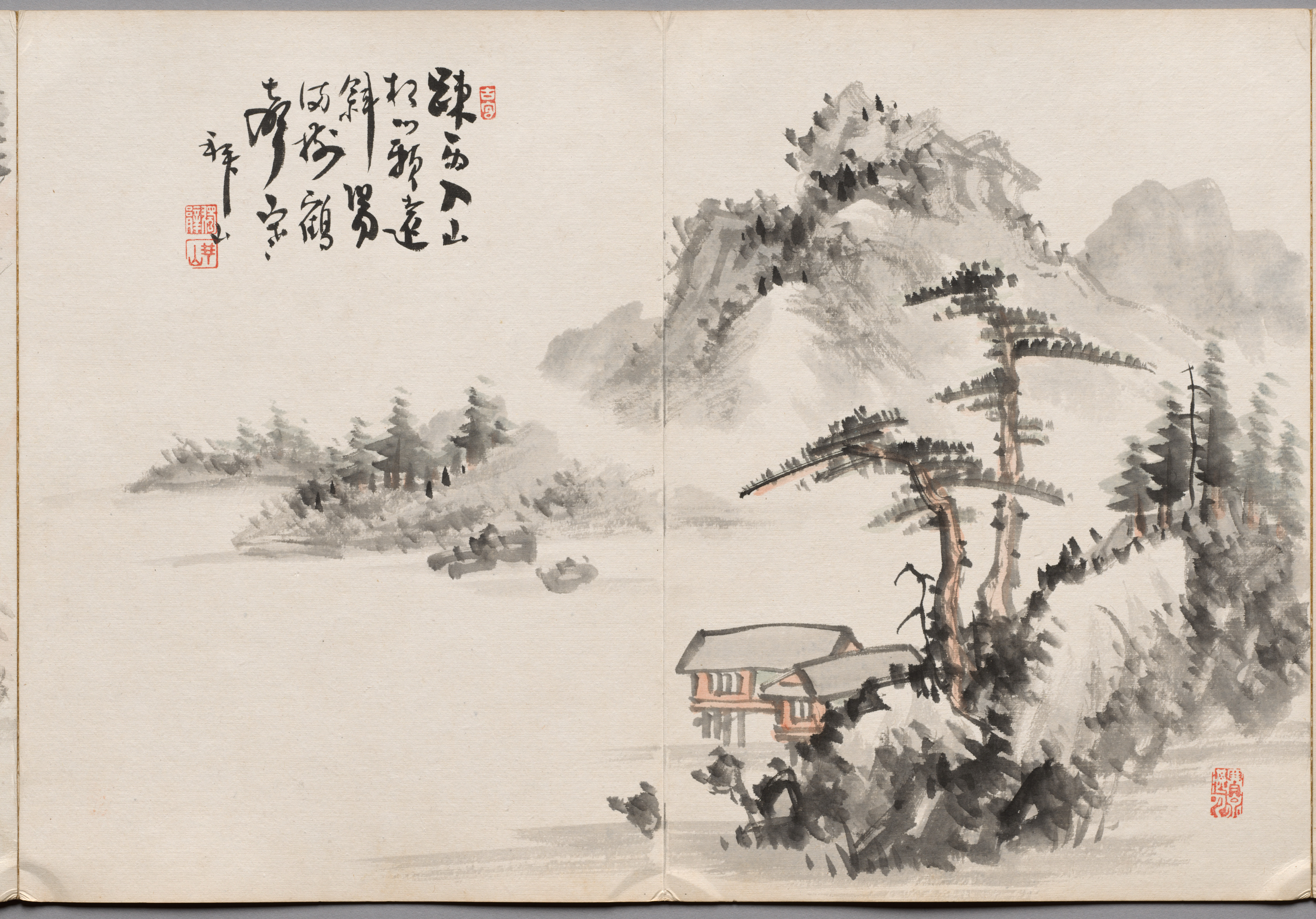 Painting One from Album of Paintings by Haizan by Yoshitsugu Haizan. An ink painting on two panels with a landscape scene on the right side and calligraphy on the top left. The right panel depicts a house with tiled roof and reddish brown walls, nestled among dark trees and foliage. The house has a boxy shape with a protruding section on the ground floor and overhanging eaves. The house sits in front of a large tree with bare trunk. Behind the house, there are mountains and more trees. The left panel contains calligraphy in black ink and two red seals. The background of both panels is a light beige color.
