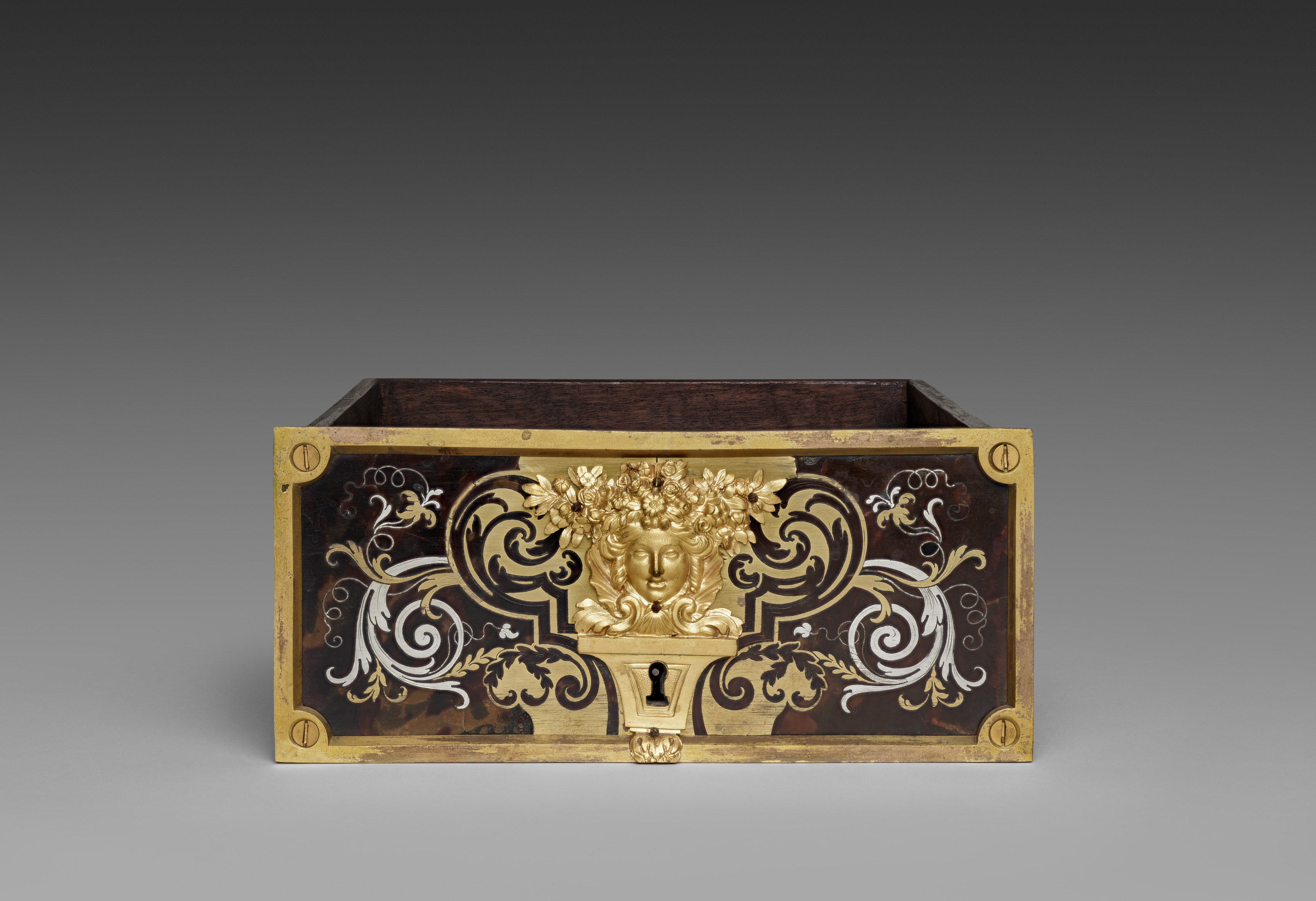 Rectangular wooden drawer with dark brown sides and bottom visible. The front and sides have a gold-colored metal frame. The front frame features a gold-colored face in the center with curly hair. There are white and gold-colored swirling designs on either side of the face. The frame has four small circular indentations, one in each corner. A keyhole is centered at the bottom. The background is gray, transitioning from light to dark.