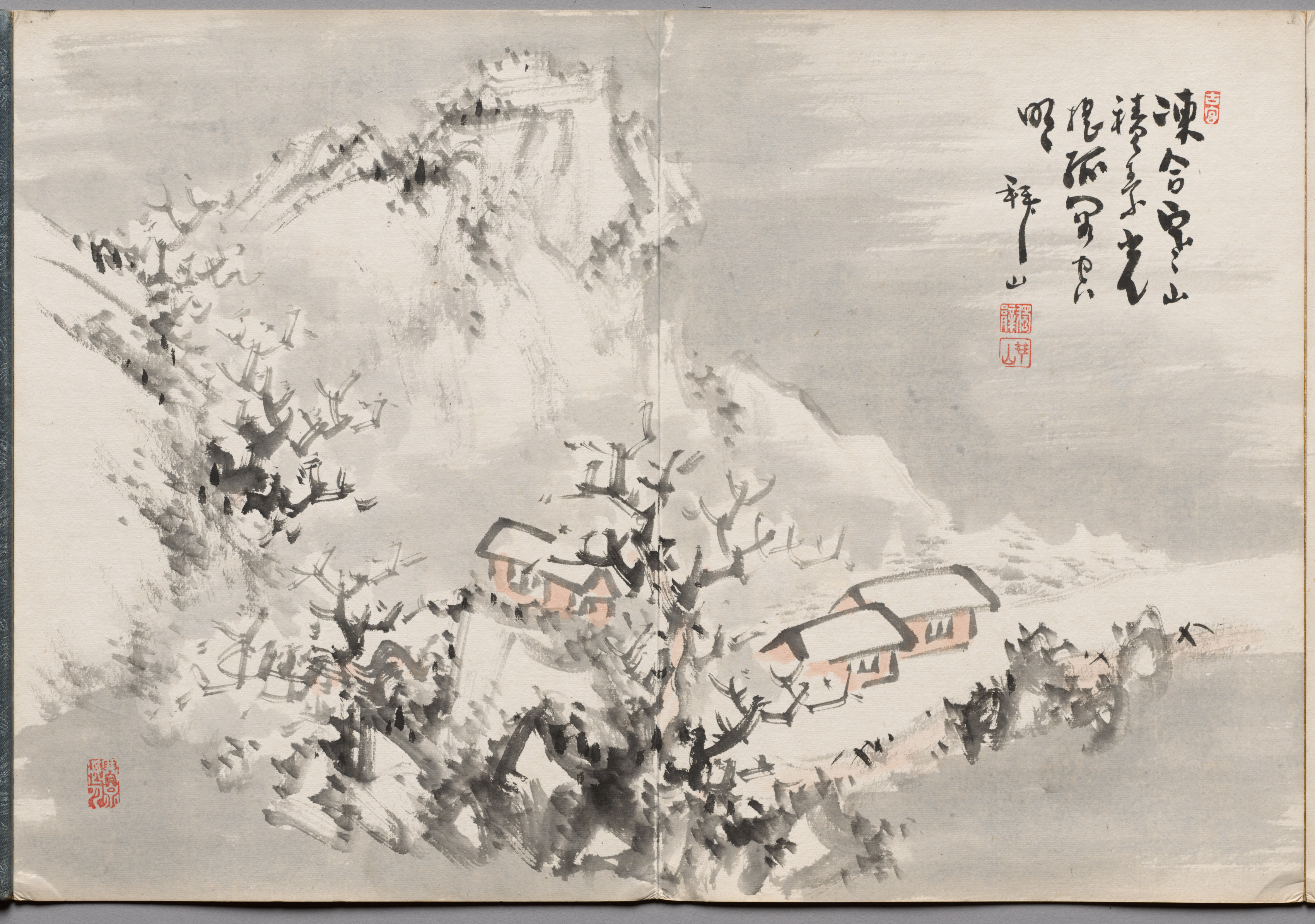 Painting Thirteen from Album of Paintings by Haizan by Yoshitsugu Haizan: The painting depicts a serene winter landscape. A large mountain with a flat top dominates the background on the left. In the foreground, several bare trees are scattered. Three small buildings with peach-colored walls and white roofs are nestled among the trees on a hillside. The sky and mountainside are rendered in shades of gray. The painting features black and red calligraphy in the top-right corner and red stamps in the top-right and bottom-left corners.