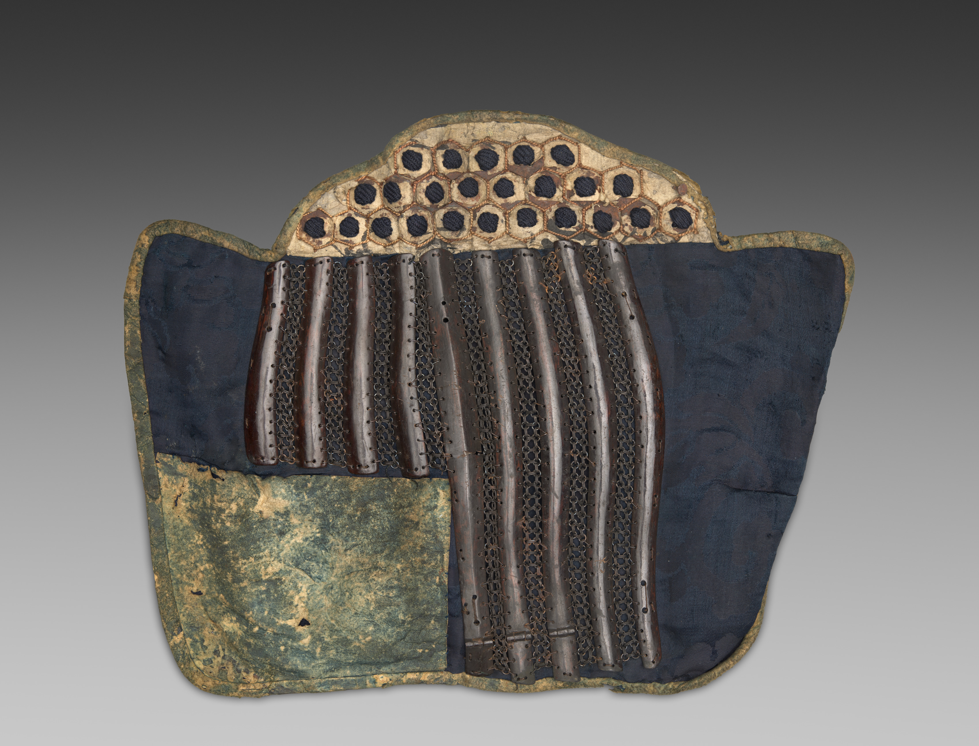 Shin Guard (Sune-ate) by Artist. A curved, irregularly shaped piece of armor with a dark blue fabric covering and a tan and black patterned top section. The top section features a honeycomb-like design with 25 circular holes. Underneath the top section are nine long, thin, curved metal pieces arranged vertically, attached to a metal mesh. The left side of the armor has a rectangular section with a greenish-tan color and visible signs of wear. The edges of the armor are trimmed with a tan material. A gradient background transitions from dark gray at the top to light gray at the bottom.