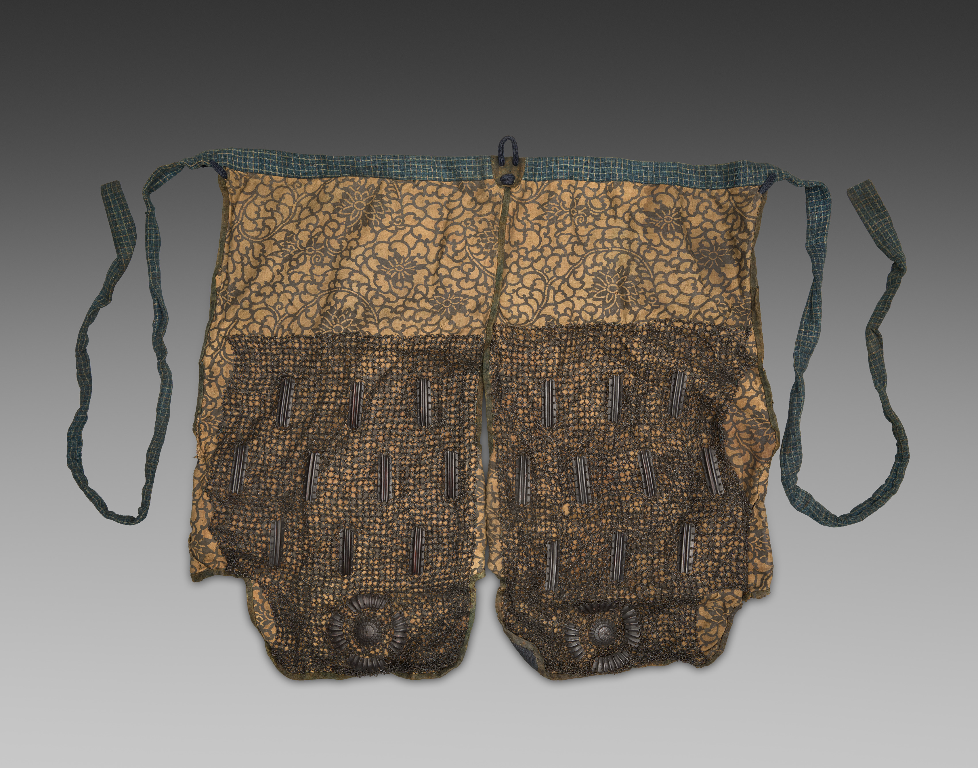 Brown fabric piece with a floral pattern on top half, and a textured pattern on bottom half. Two dark green straps on either side. A small loop at the top center. Title: Fauld (Kusazuri). Artist not specified.