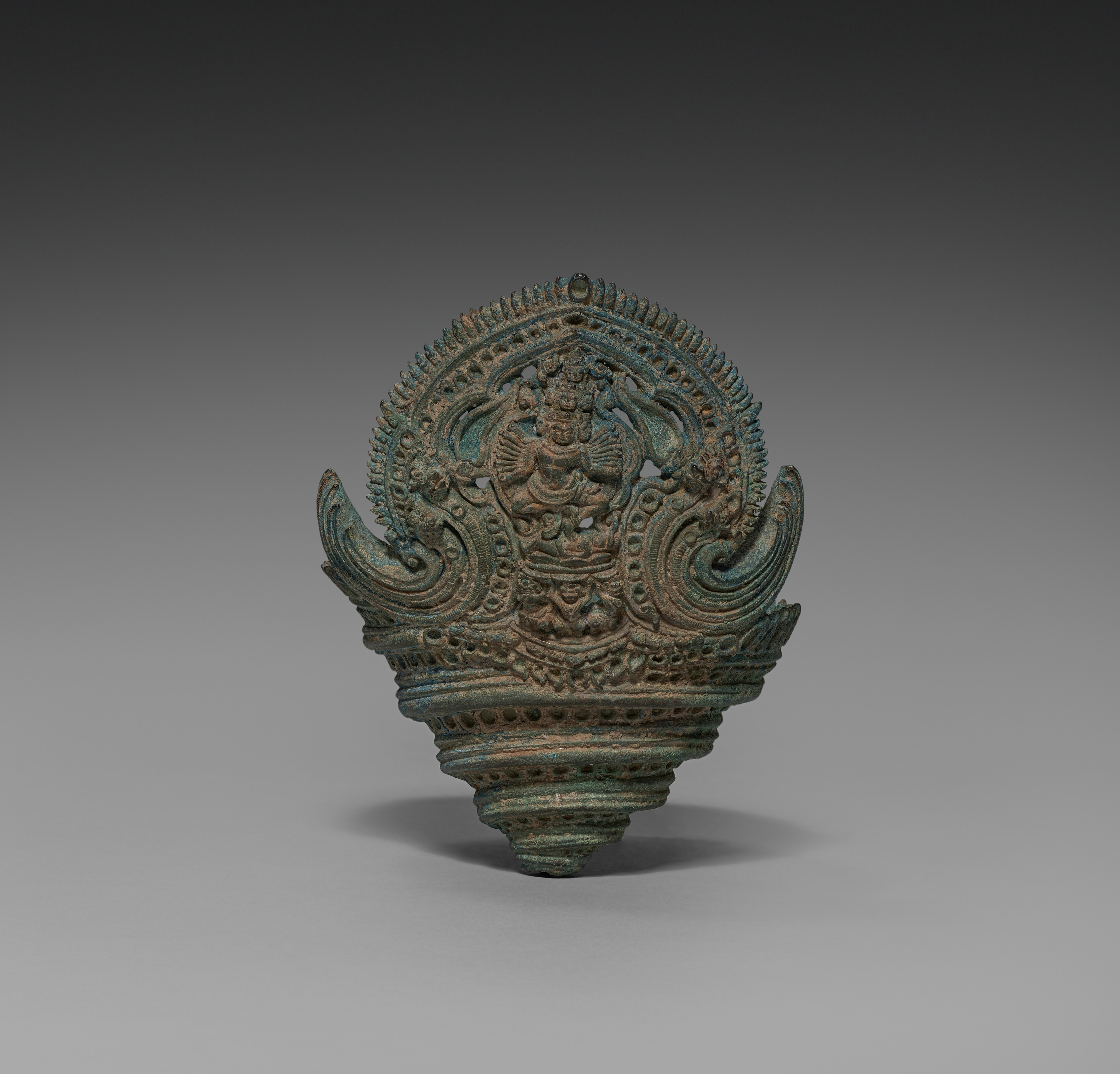 Copper alloy ritual conch shell base adorned with dancing Hevajra. The conch shell base features intricate designs, including a central figure of Hevajra, a Buddhist deity, depicted in a dancing posture. The base is ornate with swirling patterns and small decorative elements. The object exhibits a green patina. The background of the image is gray, transitioning from dark at the top to light at the bottom.