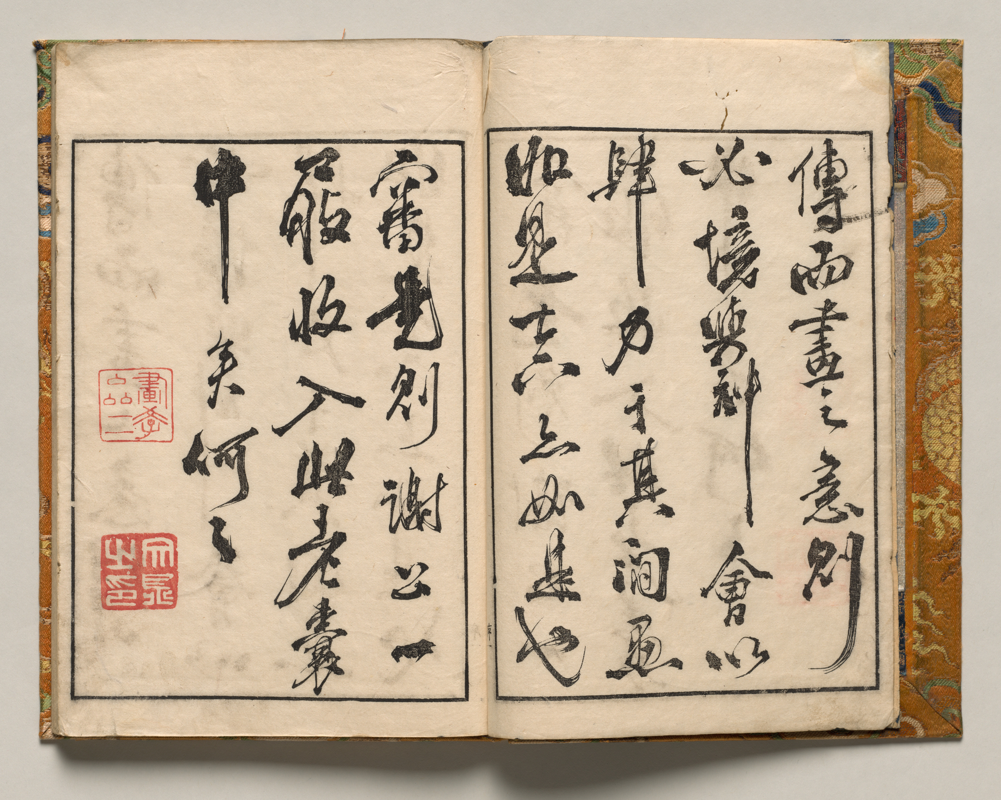 Open book showing two pages with black ink writing in a non-Latin script. Pages are off-white with darker spots and stains. Black border around the text. Two red stamps on the left page. The right edge of the book has a patterned gold border. The book is titled "Preface continued from Shazanrō Picture Book by Tani Bunchō".