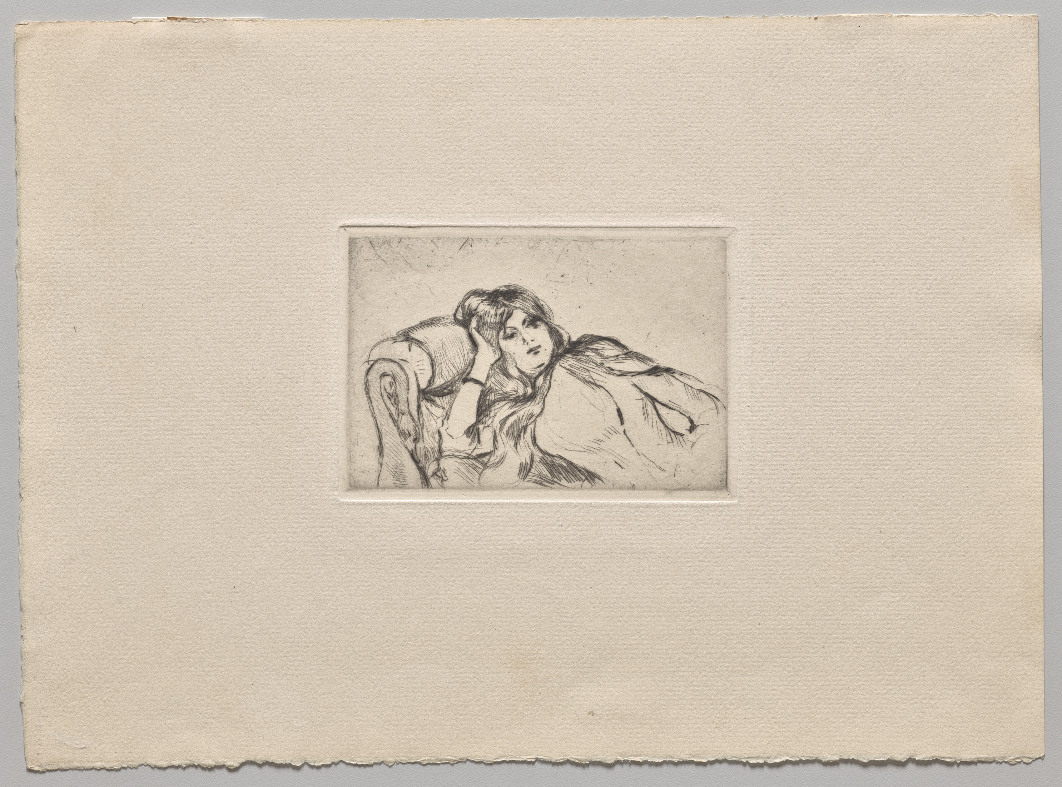The image shows a small black and white drawing of a woman, titled "Young Woman at Rest" by Berthe Morisot. The woman has long dark hair and wears a light-colored dress with a low neckline. She reclines on her side, propped on one elbow, with her head resting on her hand. Her body faces left; her head is turned toward the viewer. The drawing is centered within a rectangular recess in a piece of off-white paper, which has a rough, textured surface and rough edges. The paper appears to be mounted on a slightly larger piece of off-white paper with a smooth surface and straight edges. The background behind the paper is gray. The drawing is rendered in dark and light shades of gray.