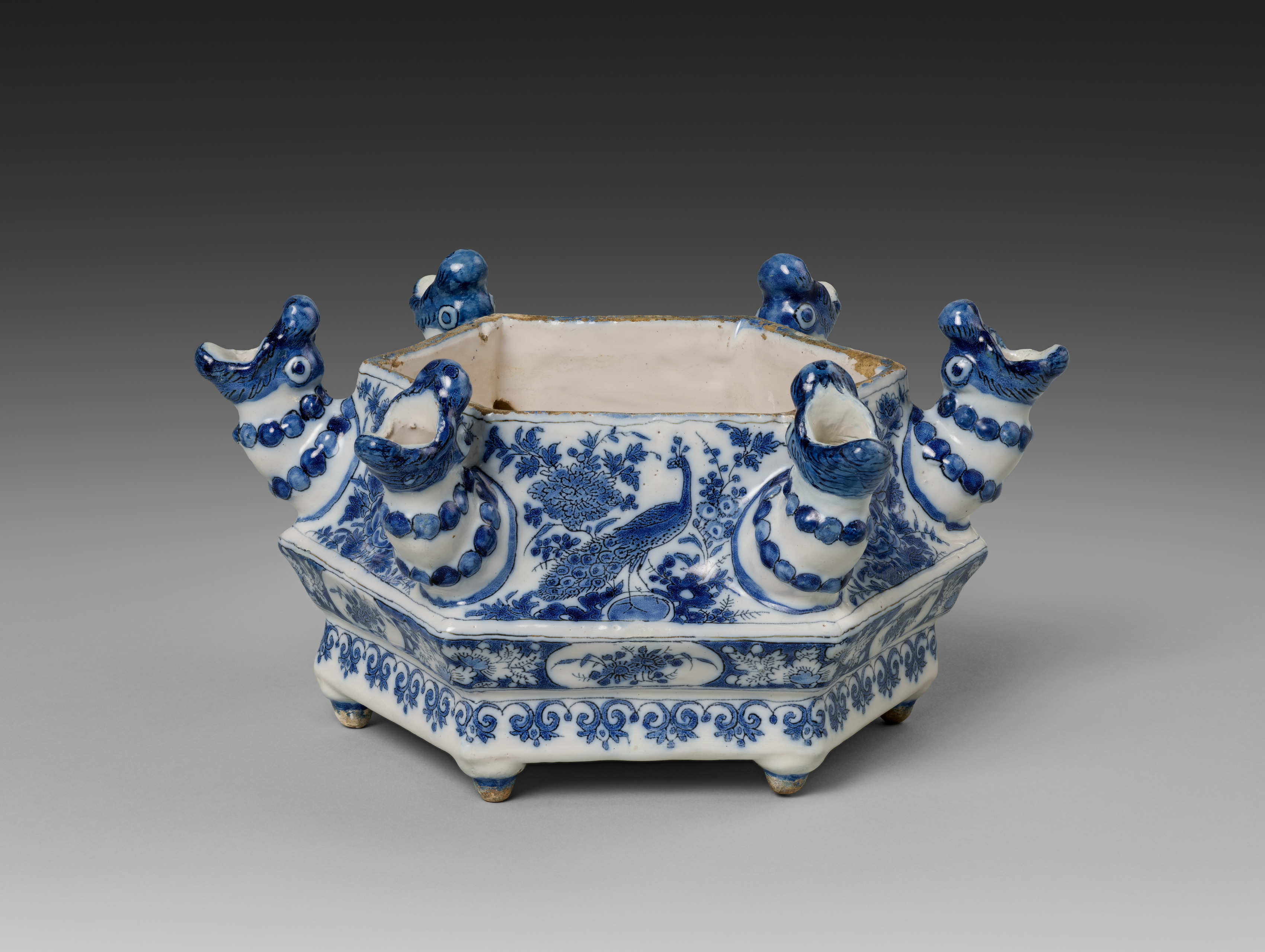 White porcelain octagonal planter with blue illustrations and decorations. The exterior has a repeating design around the bottom. On the sides are illustrations of trees and birds. The top of the planter near the rim on the outside has a floral design. Stretched across the top are six protrusions shaped like the heads and necks of swans or ducks, three on each side. The protrusions are white with blue details, and some are wearing blue beaded necklaces. The inside of the pot is unglazed and shows the tan clay. The pot stands on four small feet. The title is "First Tier for a Flower Pyramid" by Adrianus Kocx.