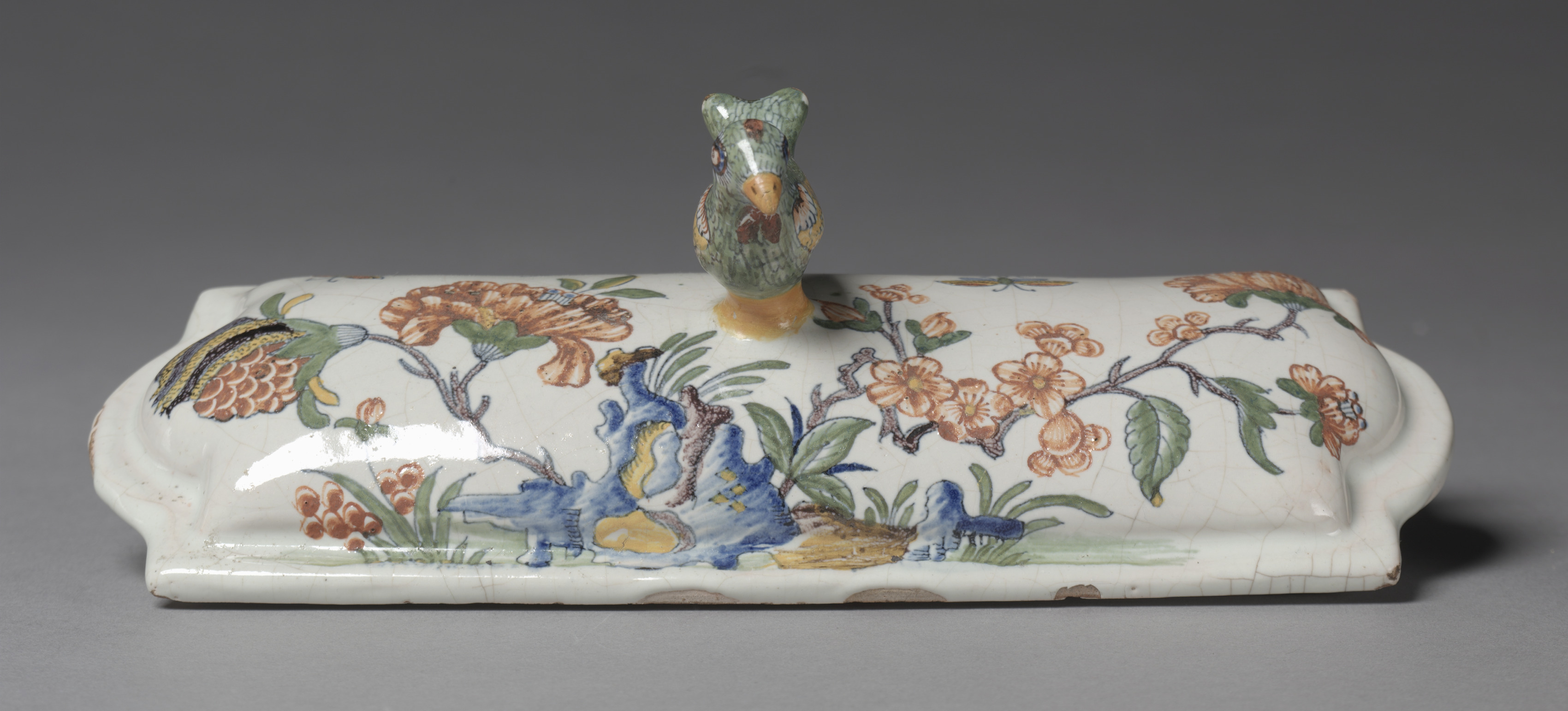 White ceramic lid with a handle in the shape of a bird. The lid is rectangular with wavy edges on the short sides. It features a colorful design with blue, green, and orange flowers and leaves. A small bird with a green head, orange beak, and brown wings sits on top of the lid. The bird's base is orange. The lid has a glossy finish and shows signs of wear around the edges. The background of the image is gray.