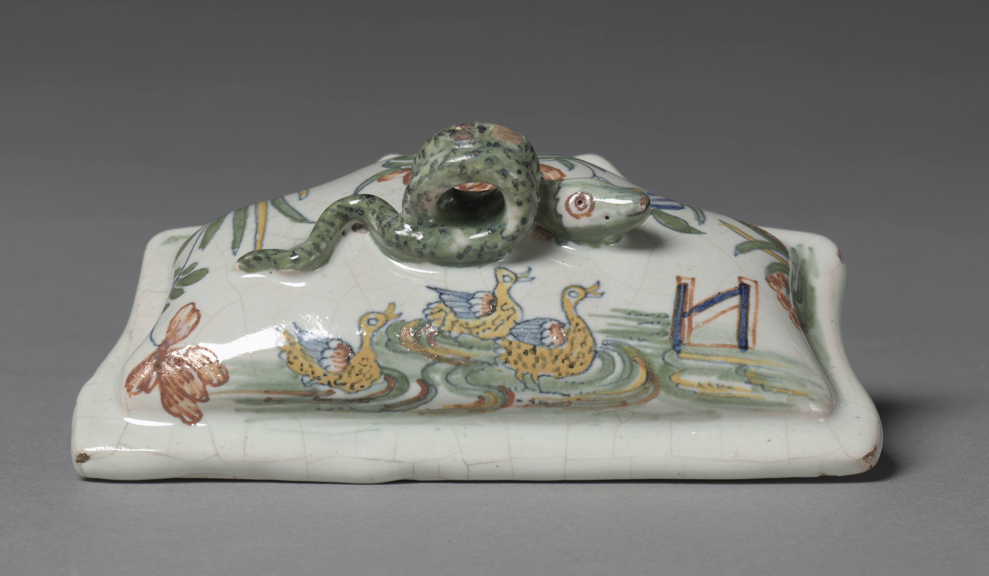White ceramic lid with a glossy finish and crackle pattern. The lid has a wavy edge and a curved handle on top shaped like a green creature with a large eye and an open mouth. The creature's body extends into a curved tail. The lid features a colorful design with a brown rabbit on the left side, and a scene in the center depicting two yellow and blue birds on water, surrounded by green leaves and a brown object. A blue and brown structure is visible on the right side. The background of the image is gray. Title: Lid from Writing Stand. Artist: Sinceny Factory.