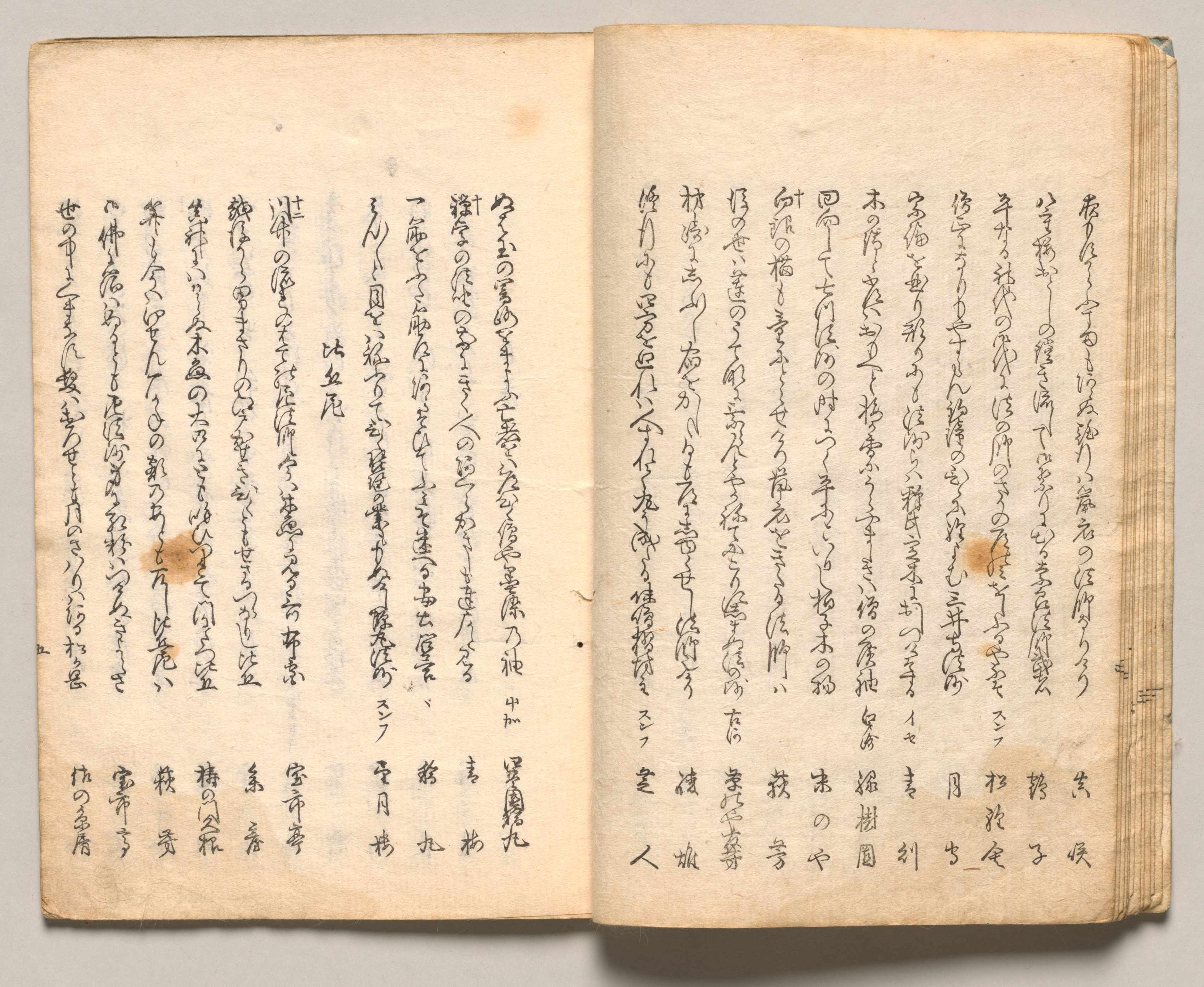 A book with yellowed pages is open to two facing pages. Both pages are filled with vertical columns of black Japanese text written on them. The pages have brown spots on them and are slightly curled. The book is lying on a grey surface.