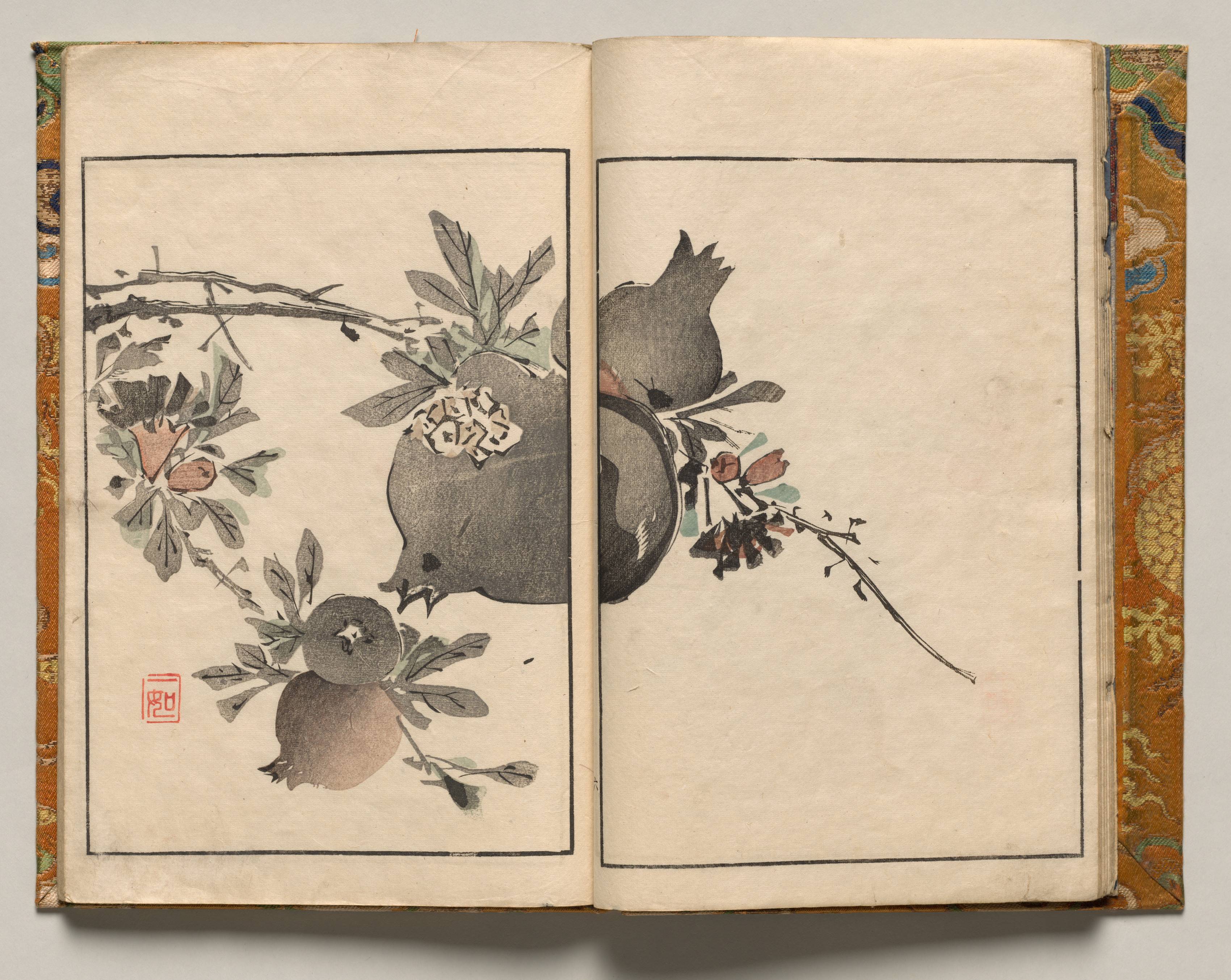Open book with two pages, left page has a drawing of pomegranates and leaves on a branch, right page blank; black border around both pages; red square stamp on bottom left; pages have aged yellowish color; brown decorative binding visible on sides.