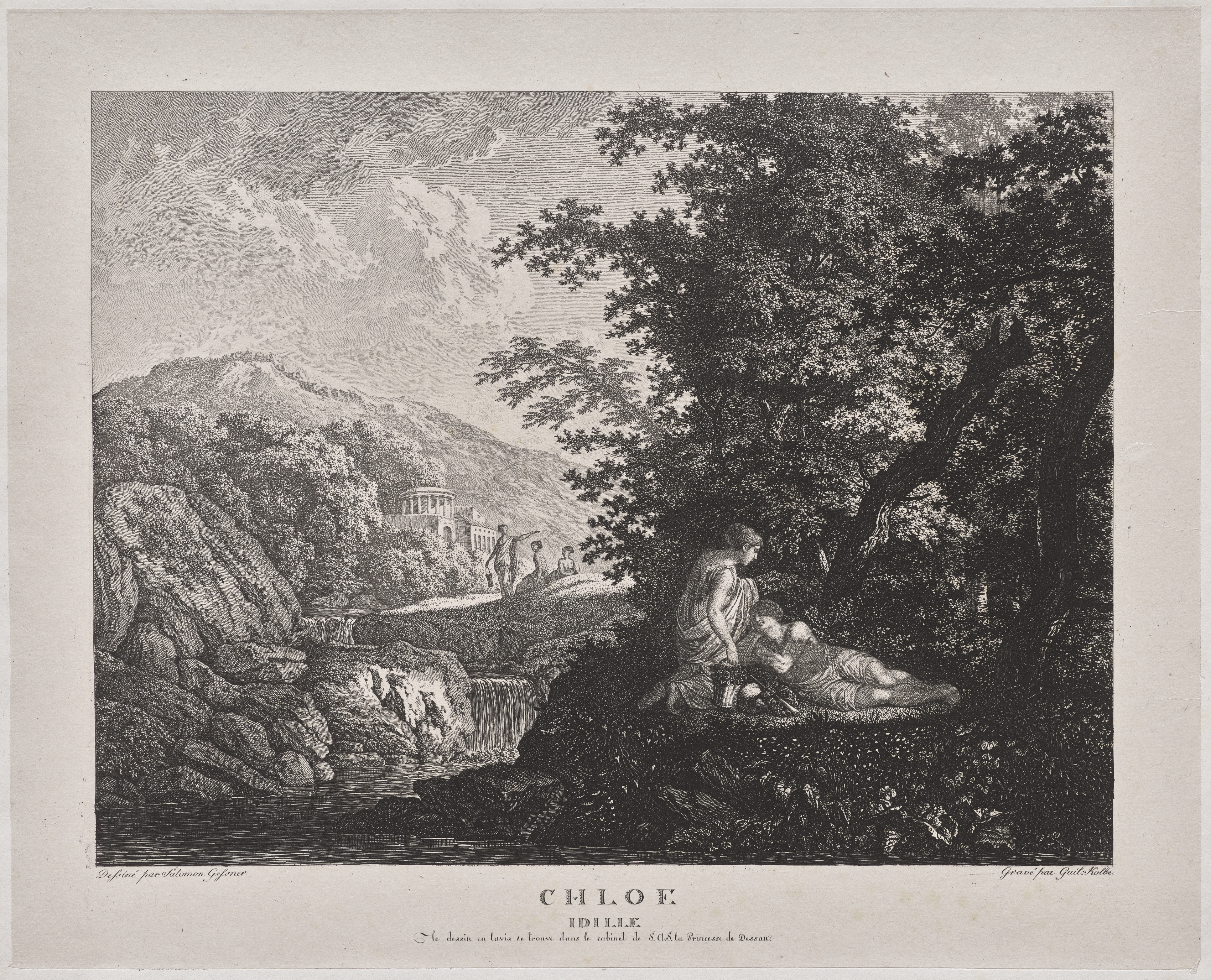 Black and white landscape drawing. Two people sit near a tree on the right side. One person lies on the ground. A rocky cliff with a small waterfall on the left. A temple with columns in the distance on the left. A mountain range behind the temple. A cloudy sky above. The words "Chloe Idylle" are written at the bottom.
