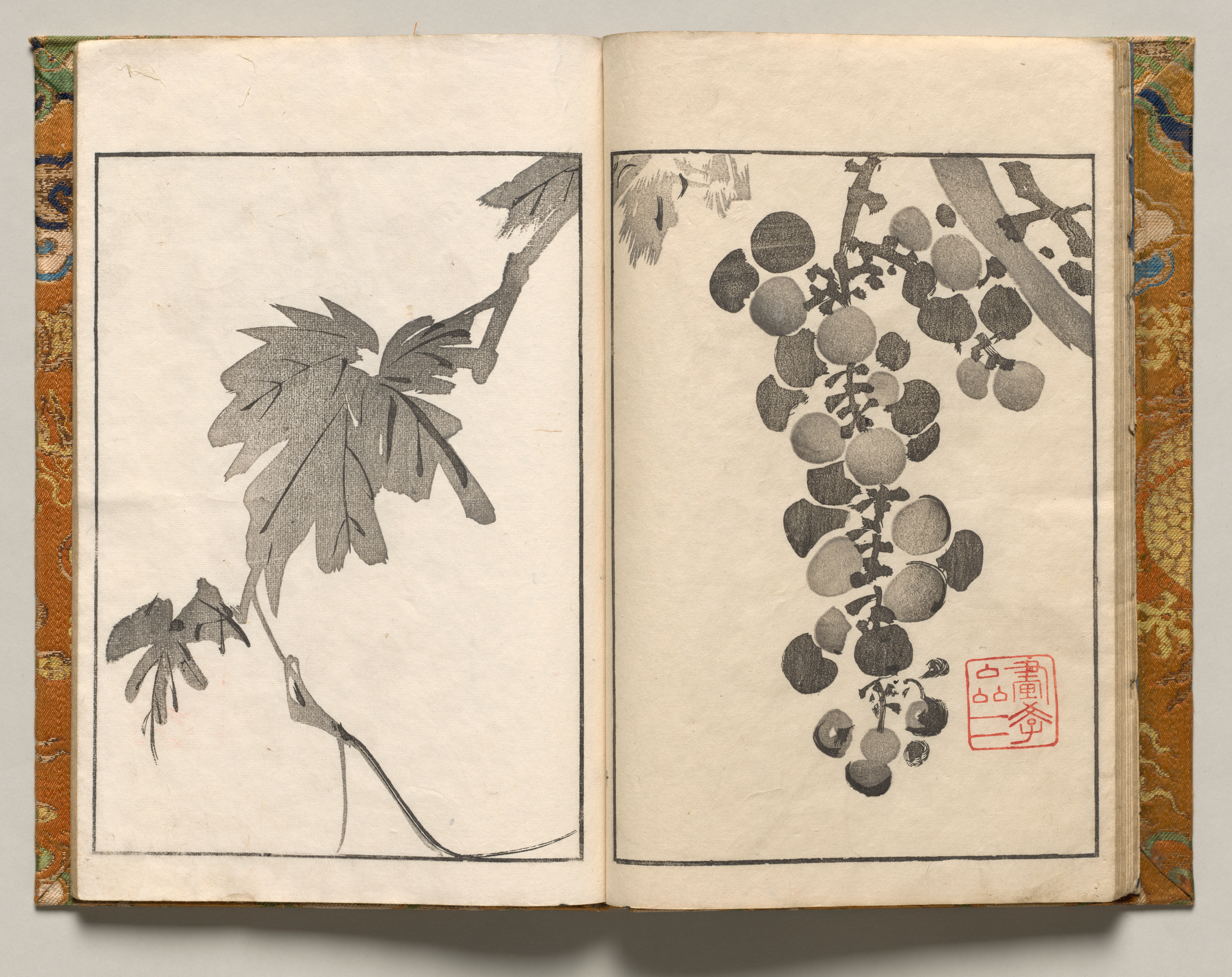 The image shows an open book with two pages featuring black and white illustrations of grapevine. The left page depicts a grapevine branch with leaves. The right page shows a cluster of grapes hanging from a vine. A red seal is visible on the bottom right corner of the right page. The pages have a thin black border. The book has a gold-colored cover with a floral pattern on the spine visible on both sides. The pages are yellowed and have a textured appearance.