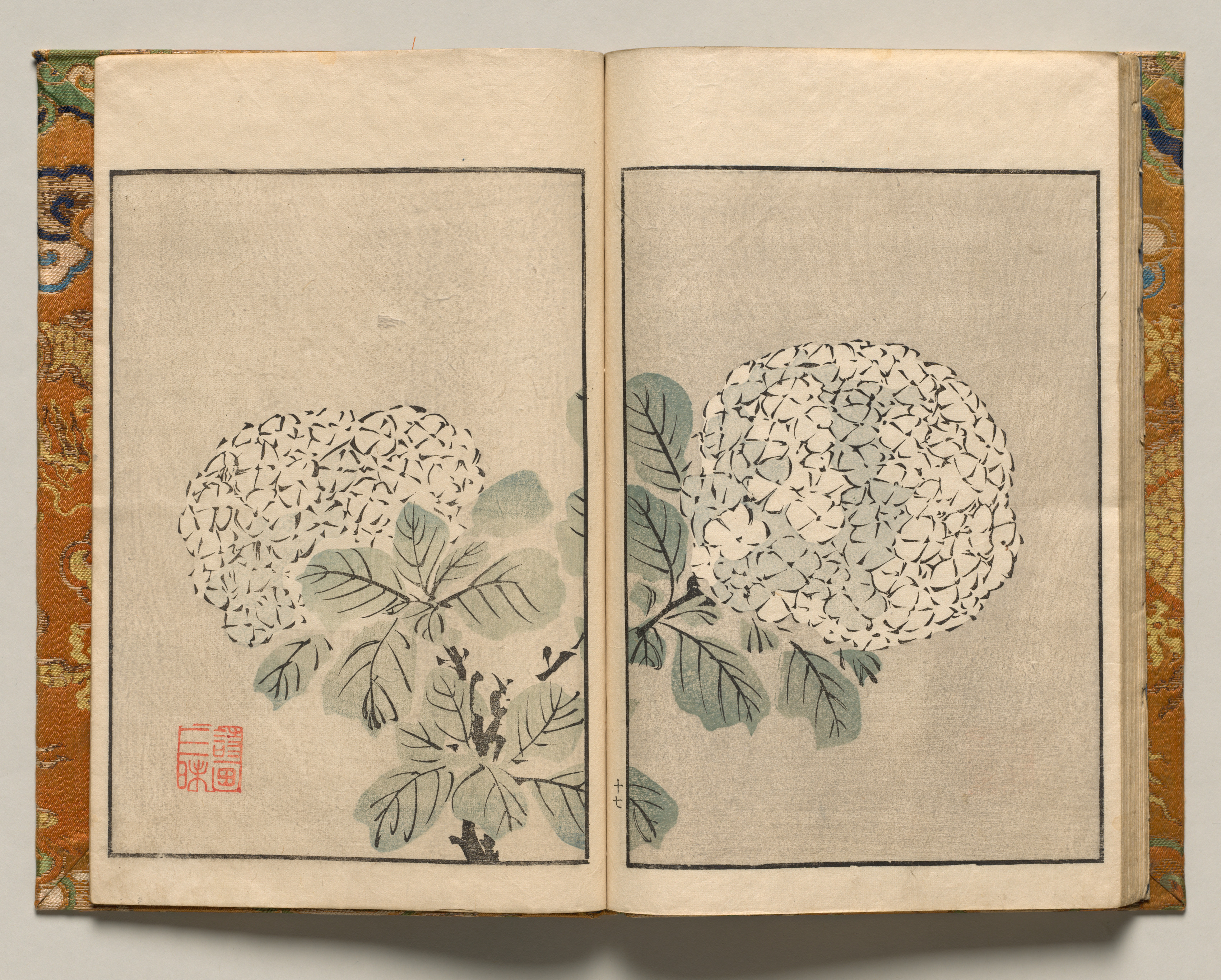 The image shows an open book with two pages facing upwards. The book's cover is visible on both sides, featuring an orange background with a gold, blue, and green pattern. The pages are yellowed and have a black border around the edges. On the left page, there is a red stamp in the bottom-left corner. Both pages feature a drawing of a hydrangea plant with large white flowers and green leaves. The left page has one large flower and several leaves, while the right page has one large flower and several leaves. The background of the pages is beige.