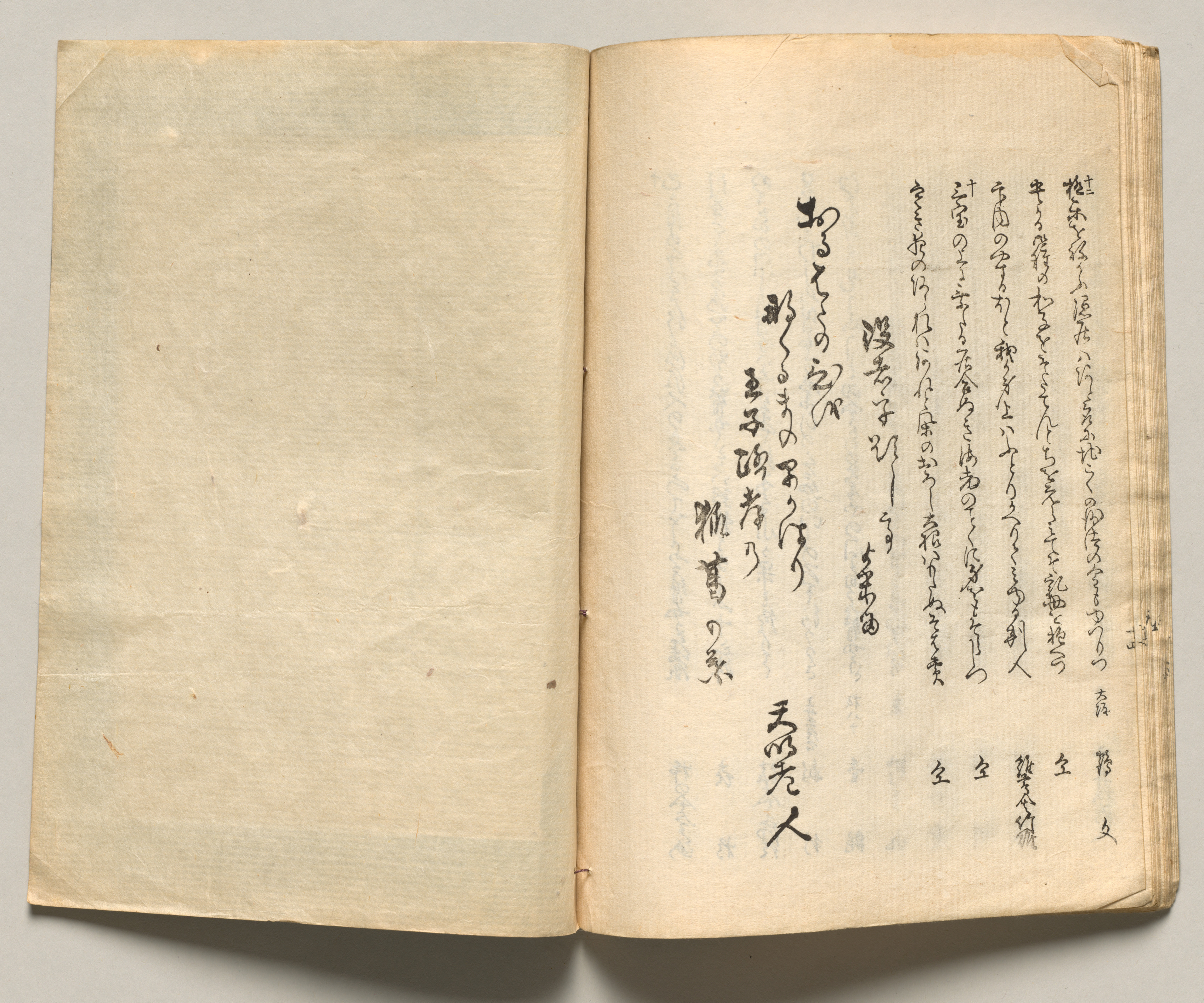 Open book showing two pages; left page is blank with light tan color and small spots; right page filled with black Japanese calligraphy arranged in vertical columns; pages are yellowed with age and have rough edges; book lies flat on a gray surface.