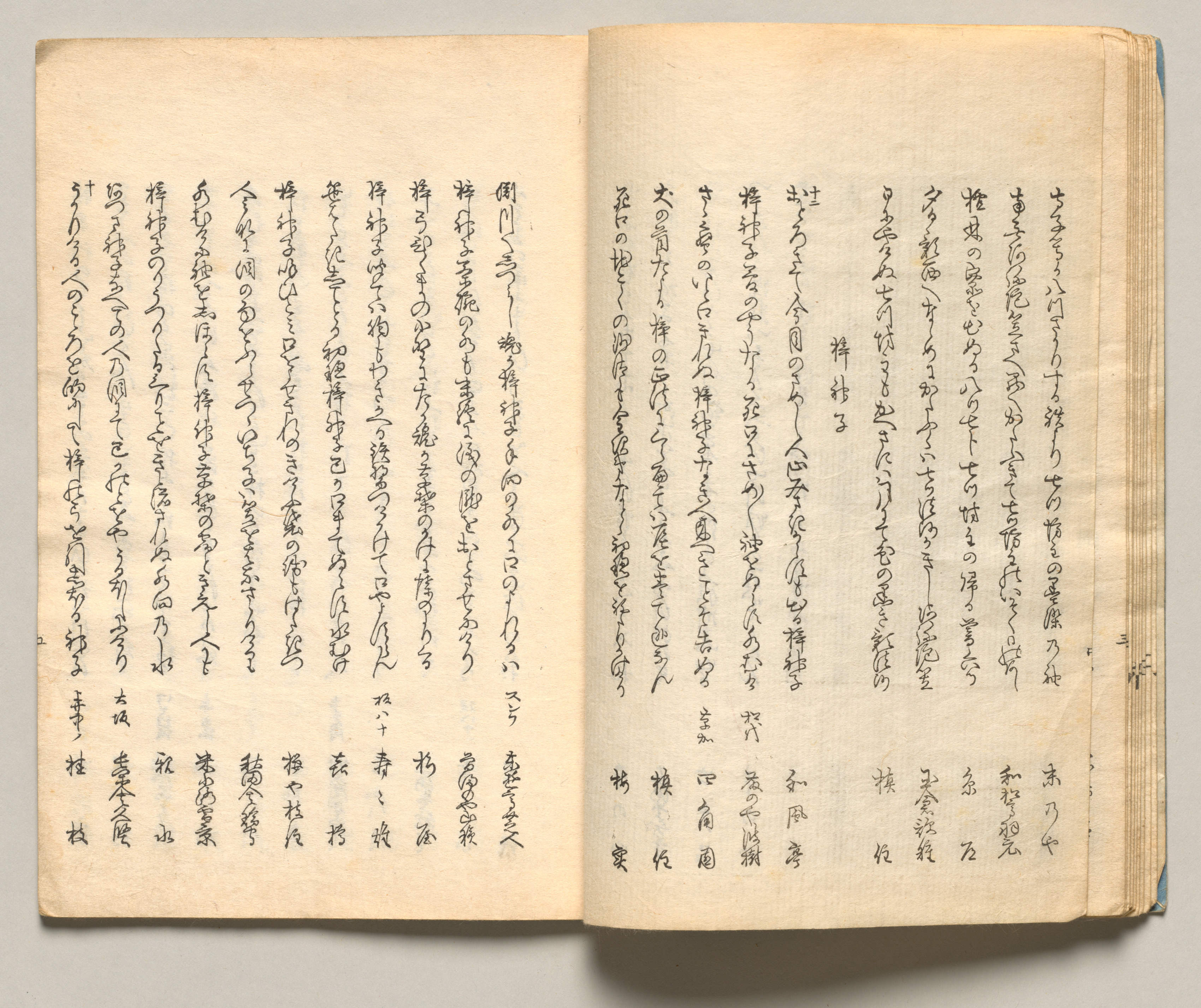Open book with yellowed pages, two pages shown. Pages are filled with black Japanese text arranged in vertical columns. The text on both pages is organized into multiple columns, with the columns on each page aligned to the left. The pages have a worn, aged appearance with darker edges. The book is set against a plain gray background.