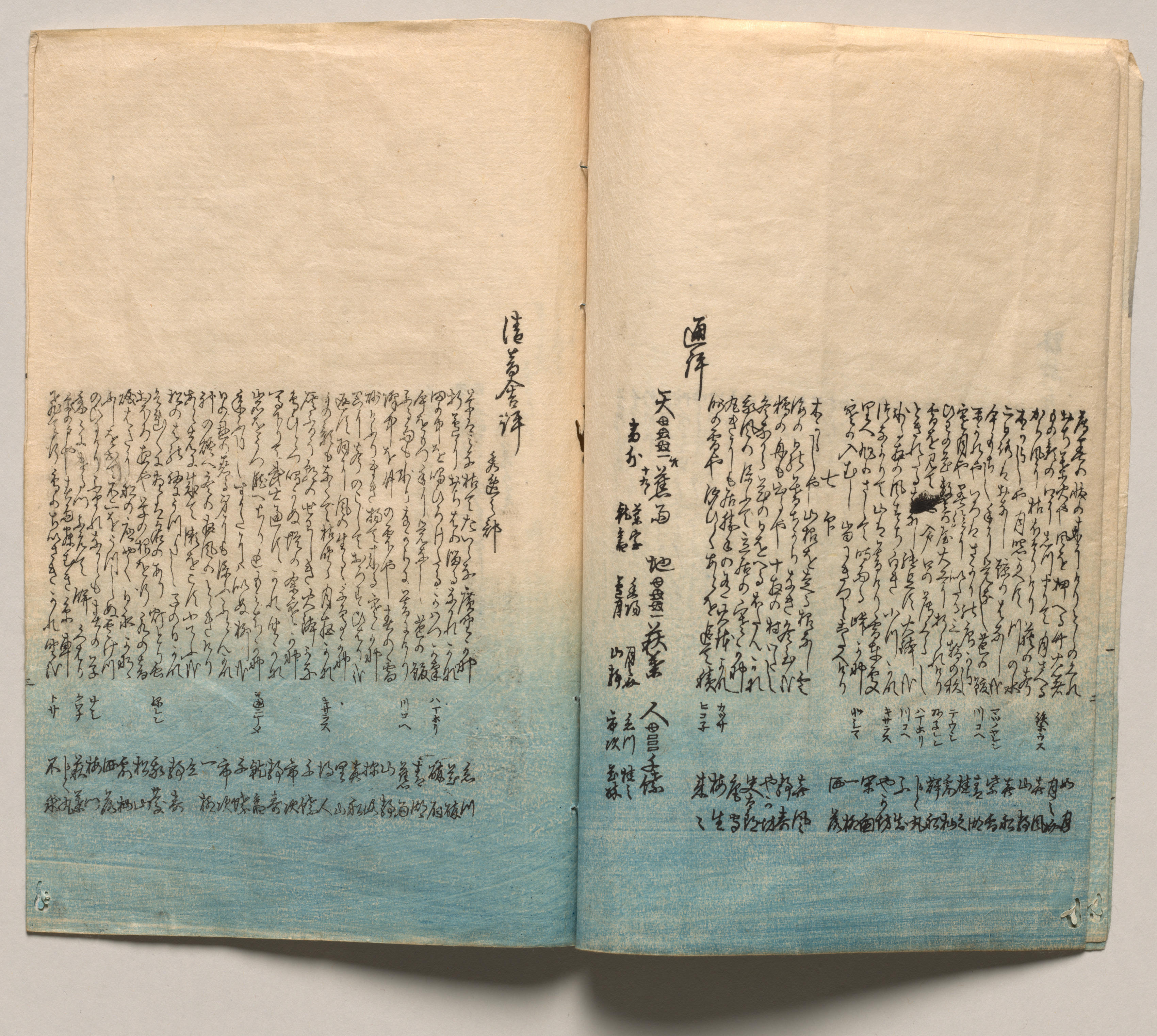 Open book with yellowed pages, featuring black Japanese text on a blue and white background, by Utagawa Hiroshige, titled "Spread Three from Verses for Winter and Spring". The book's pages are off-white and yellowed with age. The bottom third of the pages have a blue ombre background that fades into white. The majority of the pages are filled with black Japanese text written in a calligraphic style. The text is arranged in vertical columns. There are two columns of text, one on the left page and one on the right page. The text on both pages are oriented vertically and are right-aligned. The pages have a worn and aged appearance. The book lies open on a plain gray background.